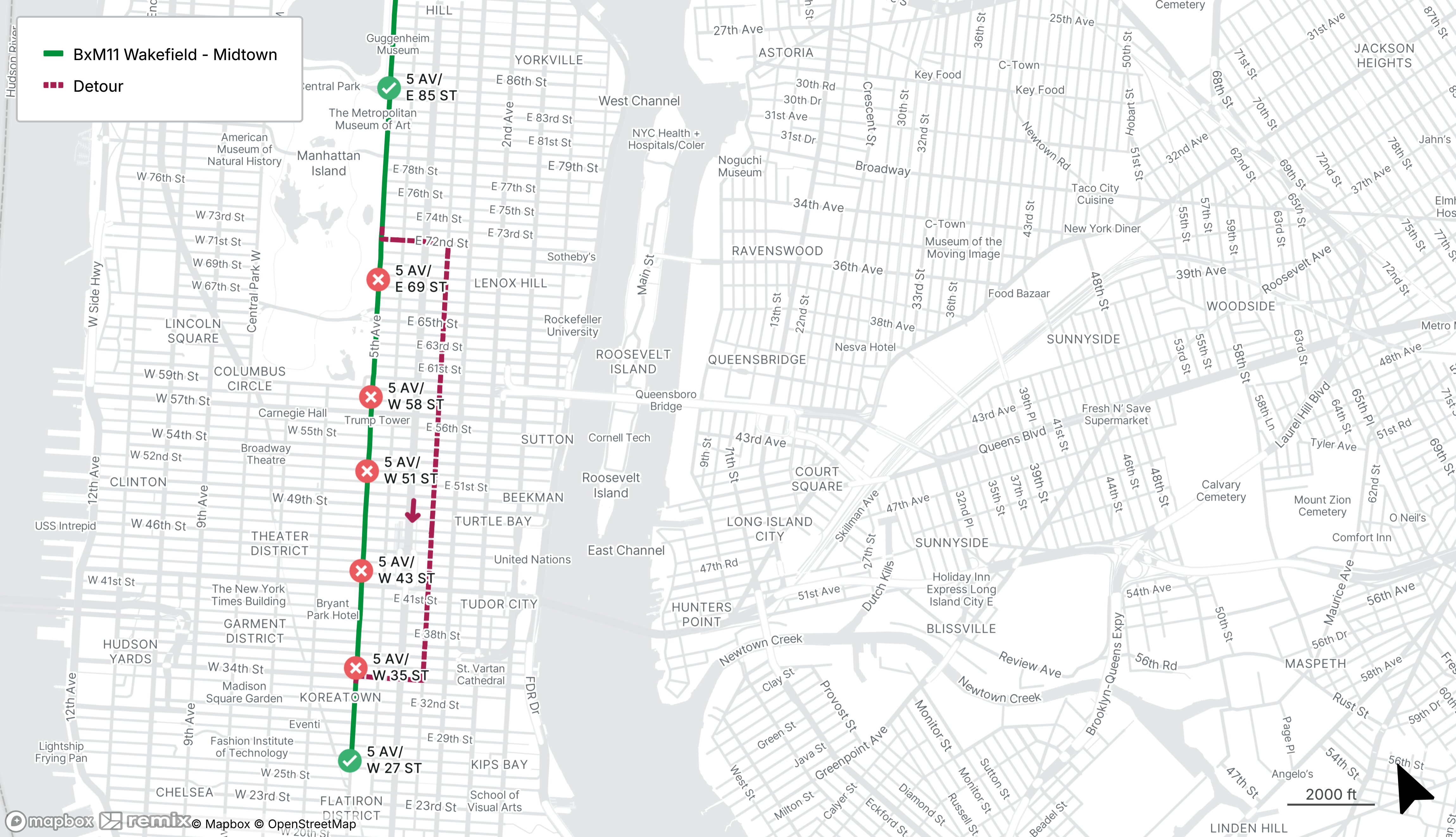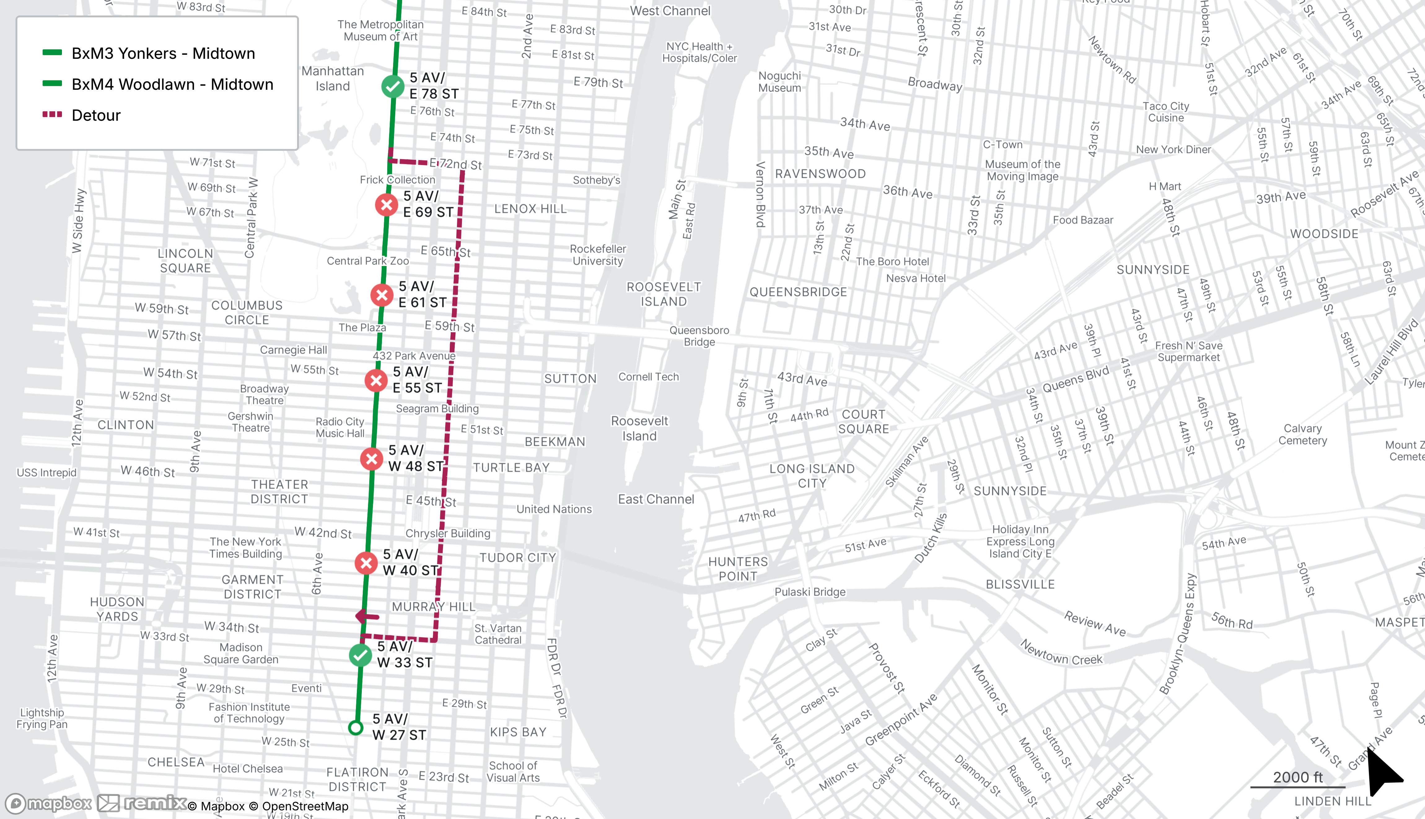 Buses will also make requested stops along Lexington Ave from E 72nd St to W 34th St.
