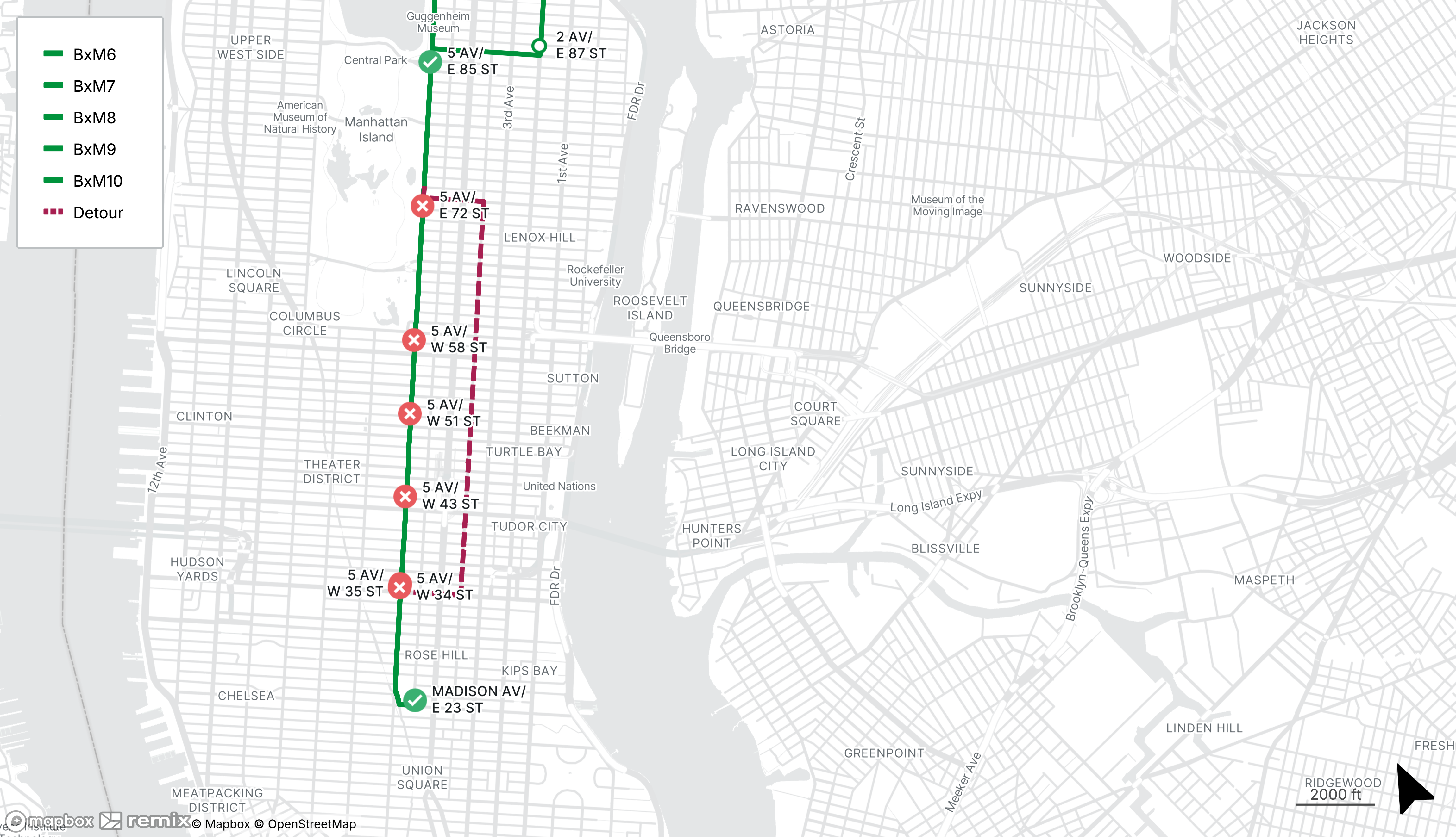 Southbound BxM3, BxM4, BxM6, BxM7, BxM8, BxM9, BxM10 and BxM11 stops along 5th Ave from E 72nd St to W 34th St will be closed