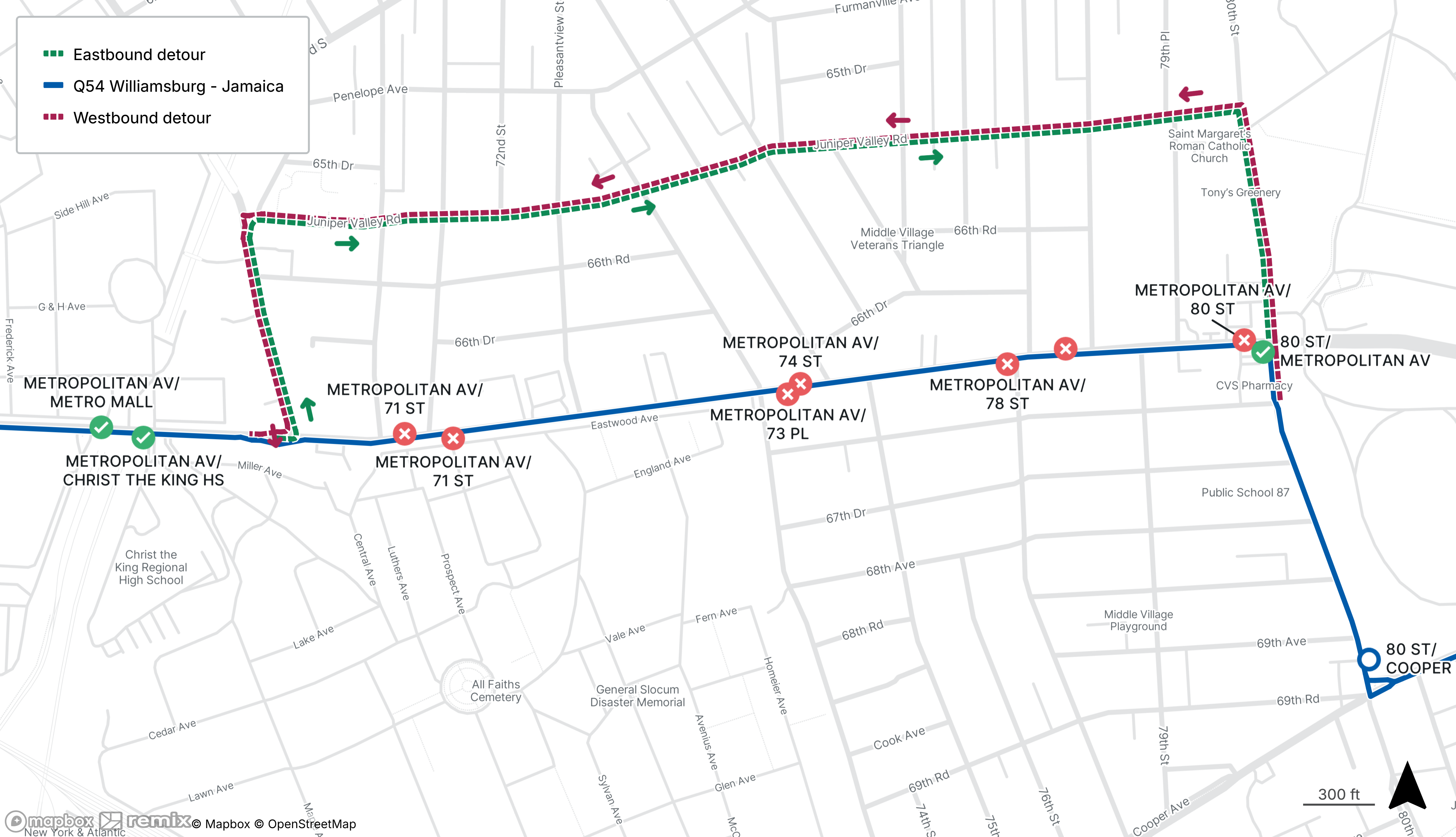 Q54 buses will be detoured from Metropolitan Ave between 69th St and 80th St
