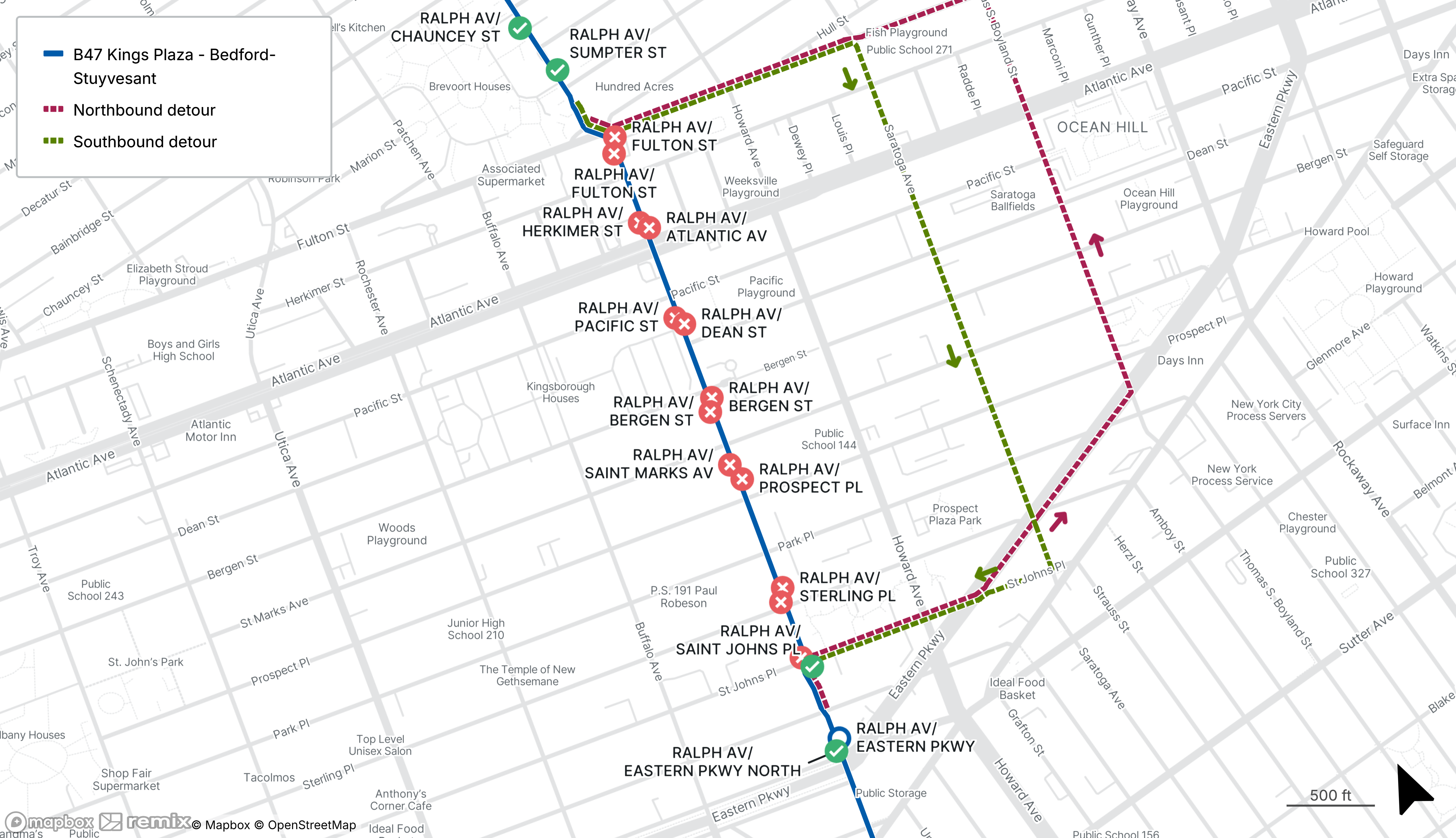 B47 buses will be detoured from Ralph Ave between Saint Johns Pl and Fulton St