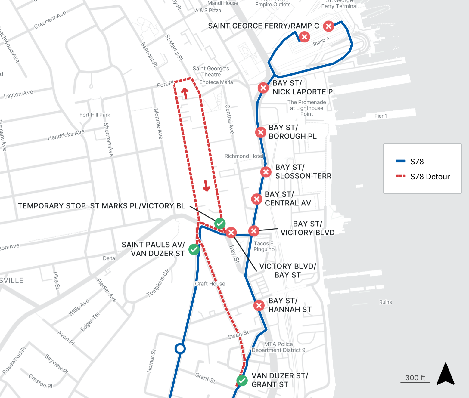 All S78 stops along Bay St between Victory Blvd and St George Ferry and the northbound stop on Bay St at Hannah St are closed
