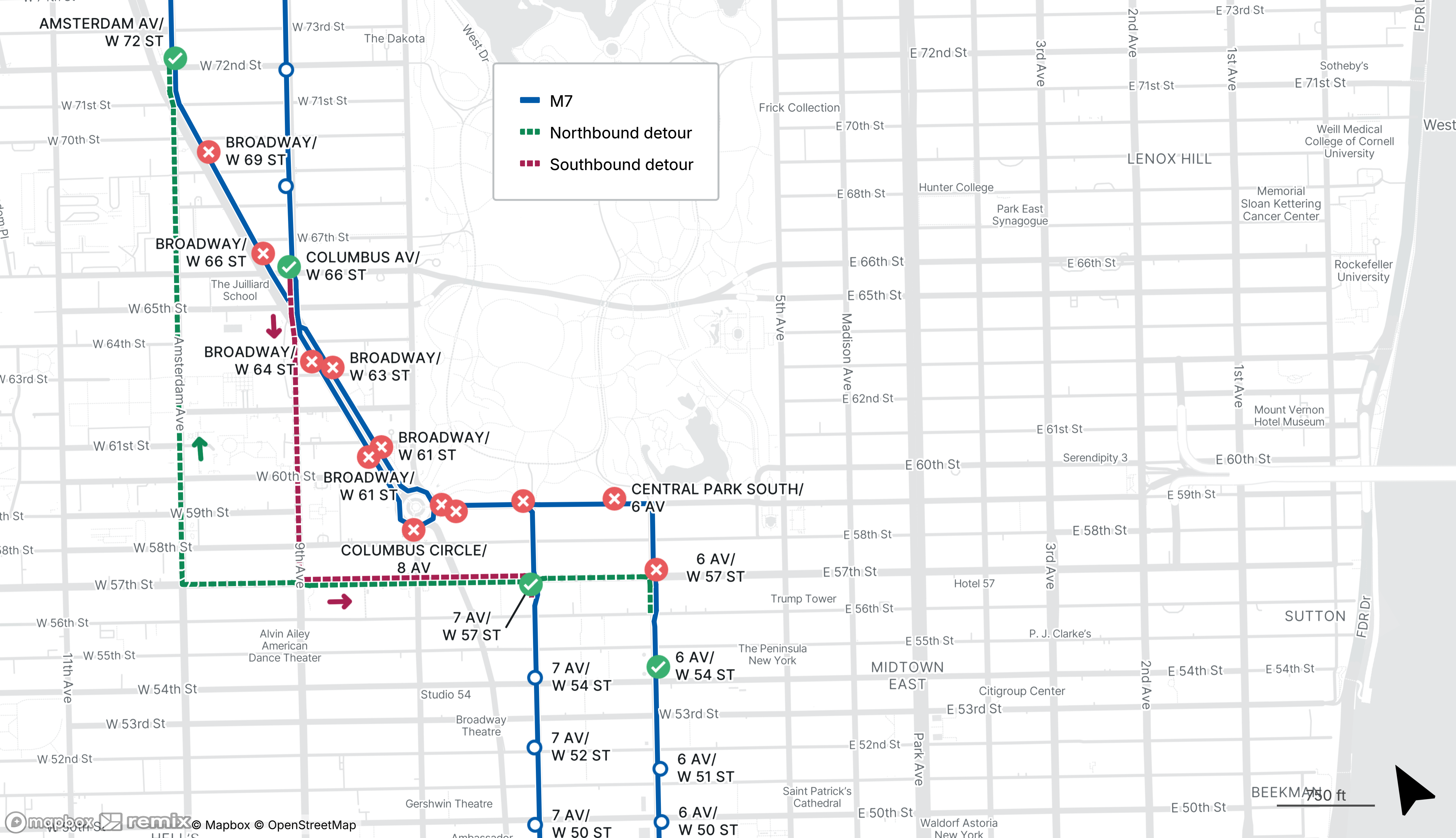 M7 buses will be detoured between 6th Ave at W 57th St and Amsterdam Ave at W 71st St
