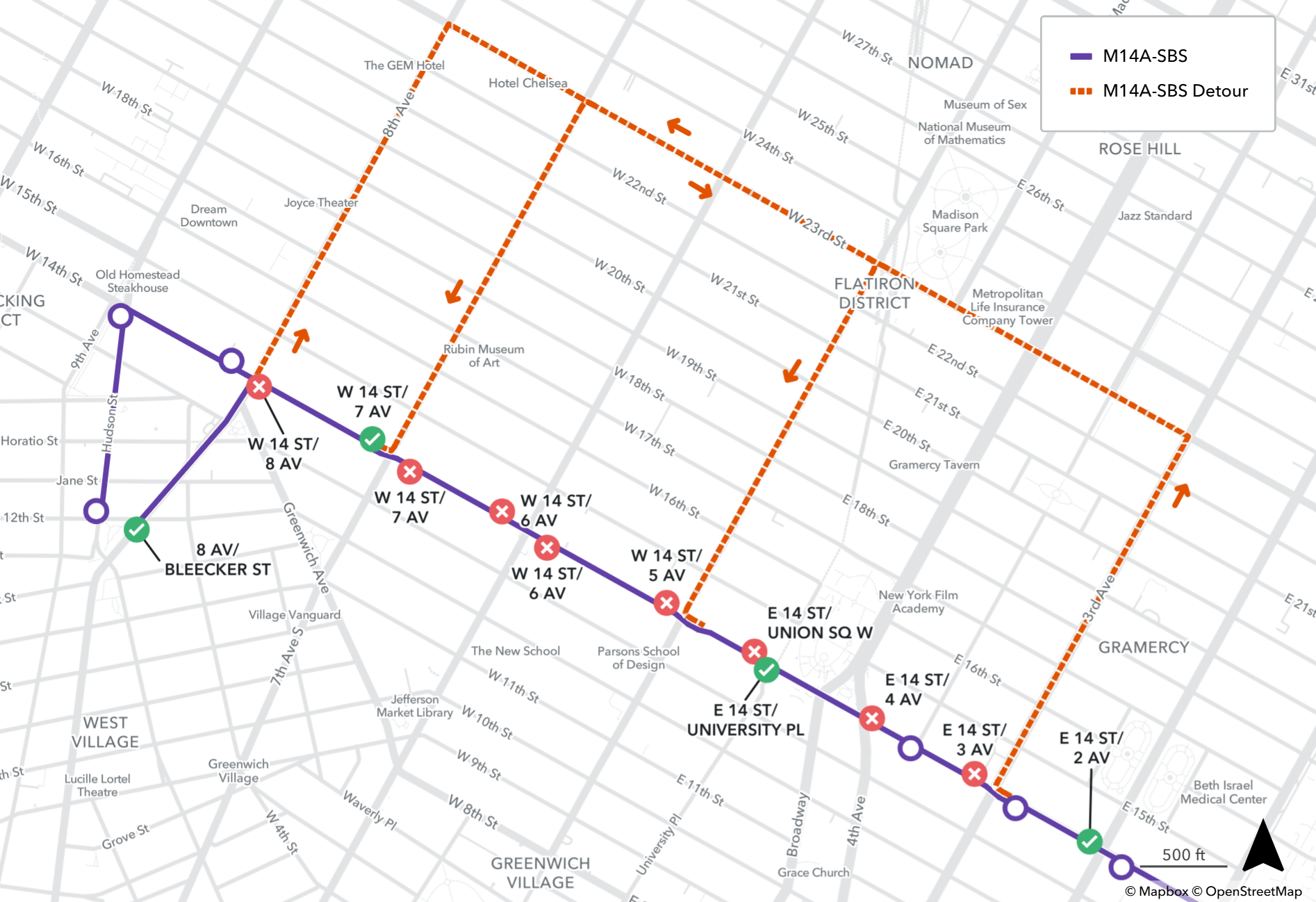 M14A-SBS buses are detoured in both directions from 14th St between 3rd Ave and 7th Ave