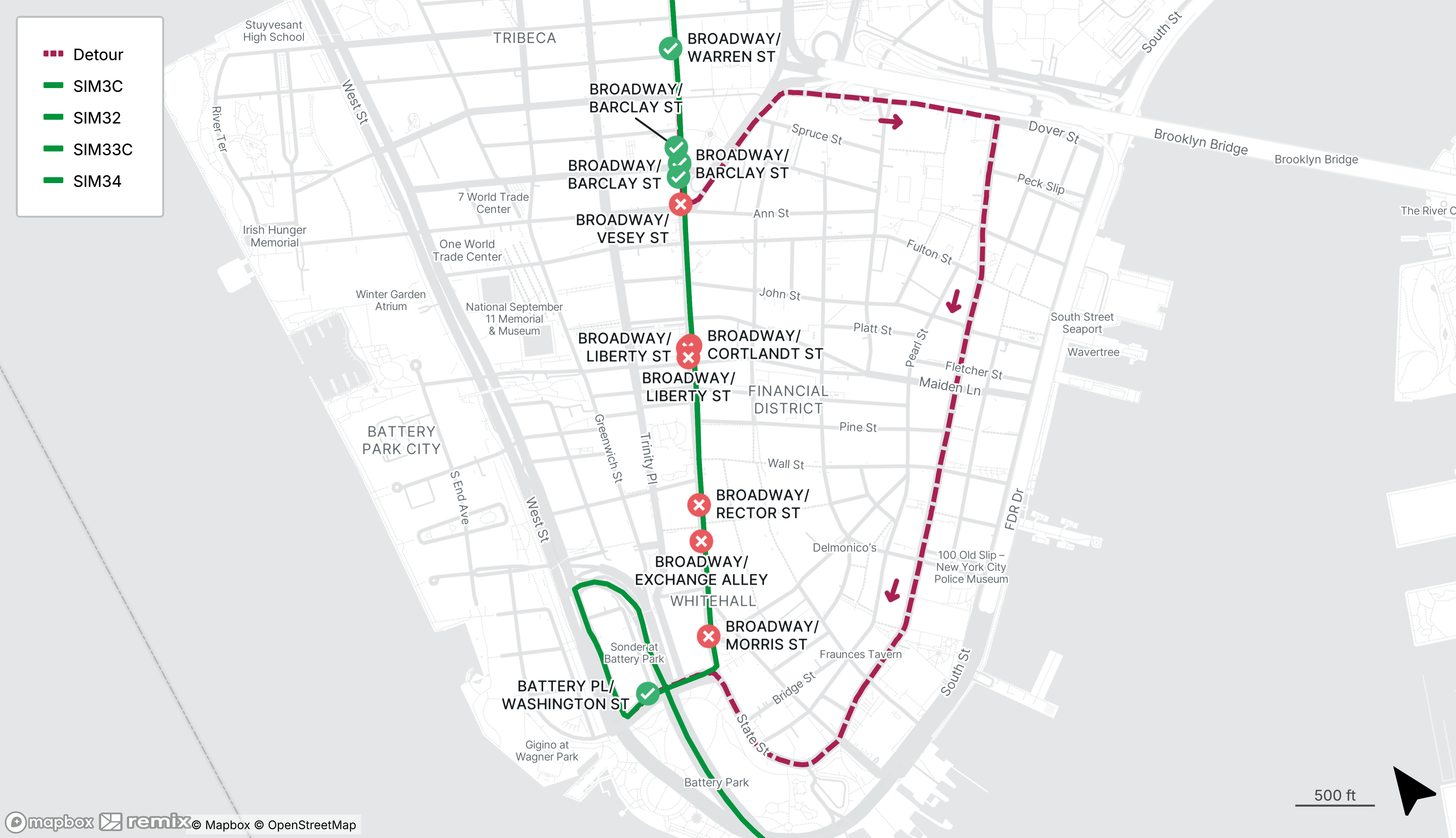 Southbound SIM3C, SIM32, SIM34, SIM33C stops on Broadway from Vesey St to Morris St will be closed