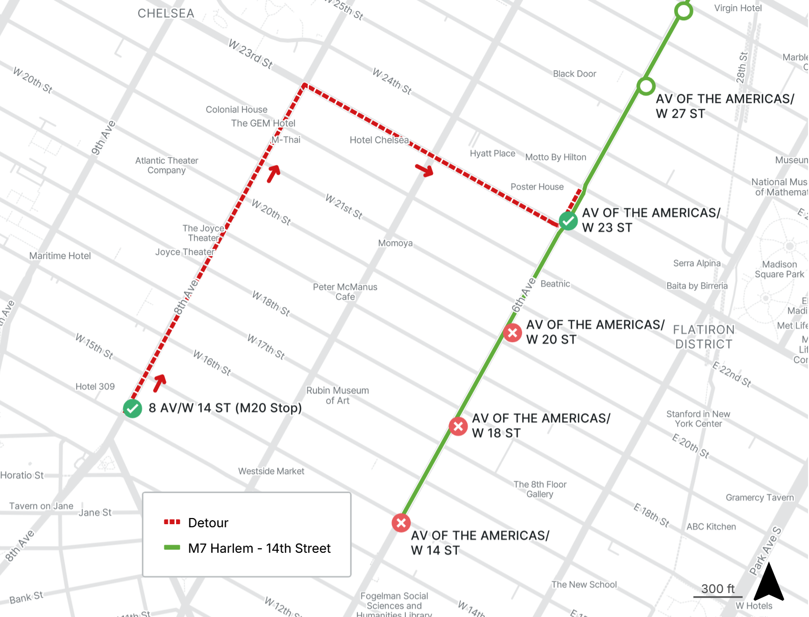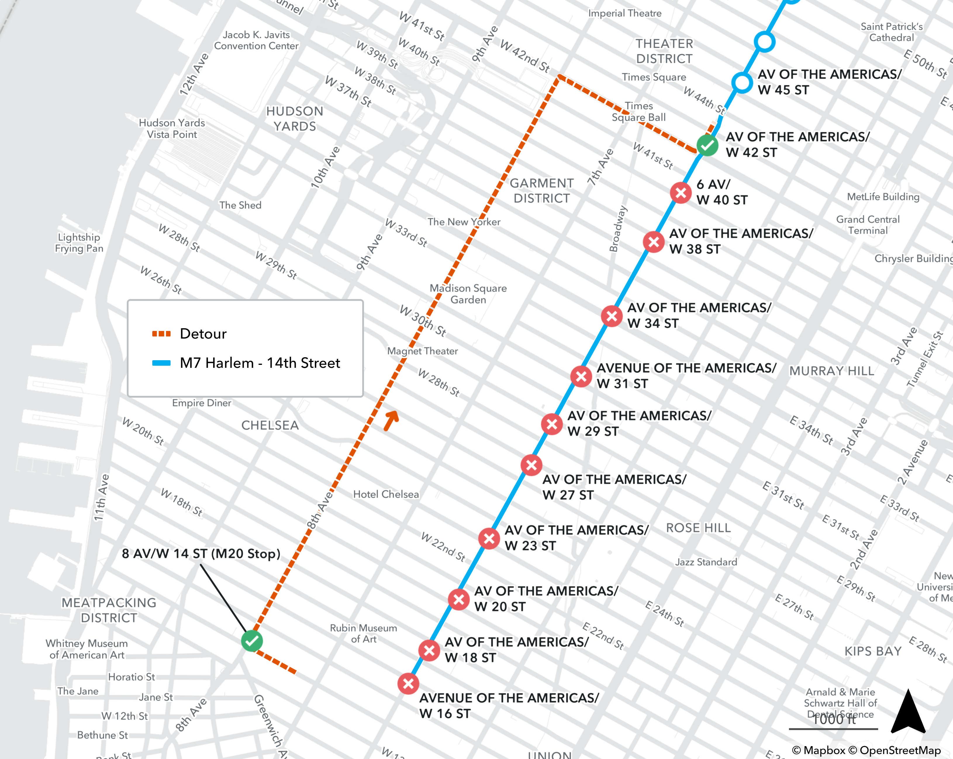 Starts Fri Oct 31 Until Sat Nov 1Buses will drop-off customers on W 14th St at 7th Ave and then proceed to the M20 stop on 8th Ave at W 14th St for northbound service.