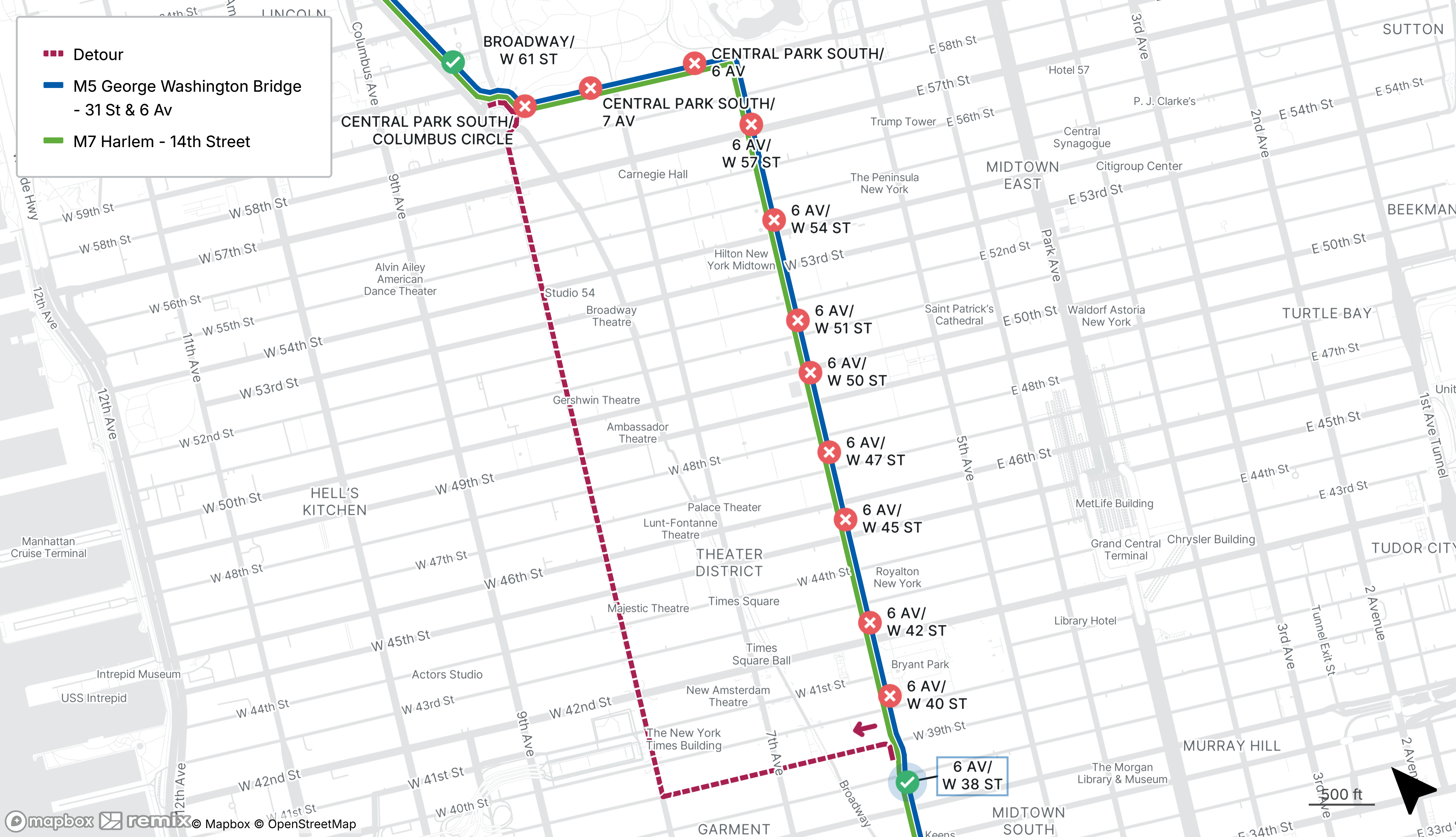 Northbound M5 and M7 stops along 6th Ave from W 40th St to W 57th St and along Central Park South from 6th Ave to Columbus Circle will be closed