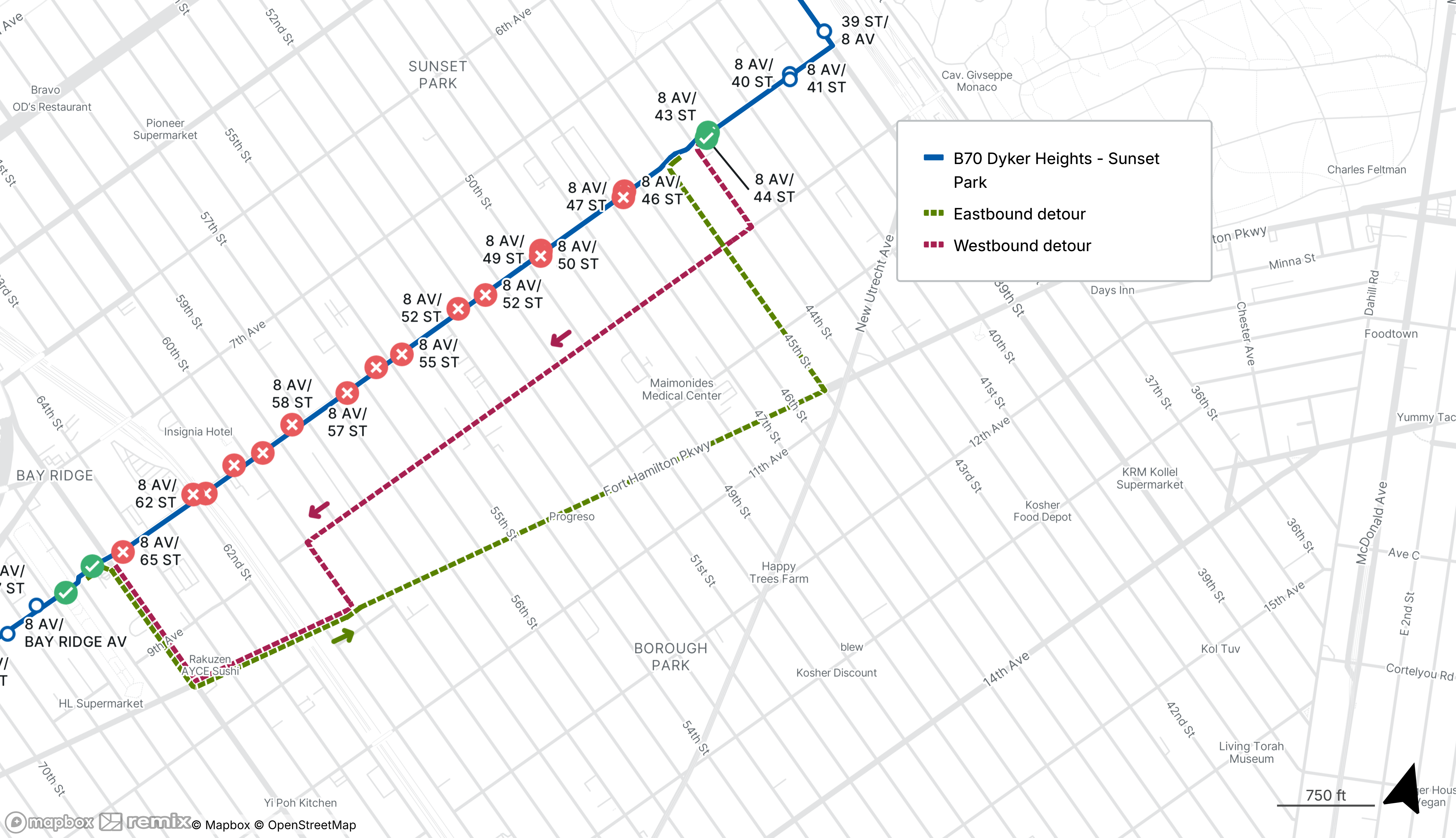 B70 buses will be detoured from 8th Ave between 44th St and 65th St