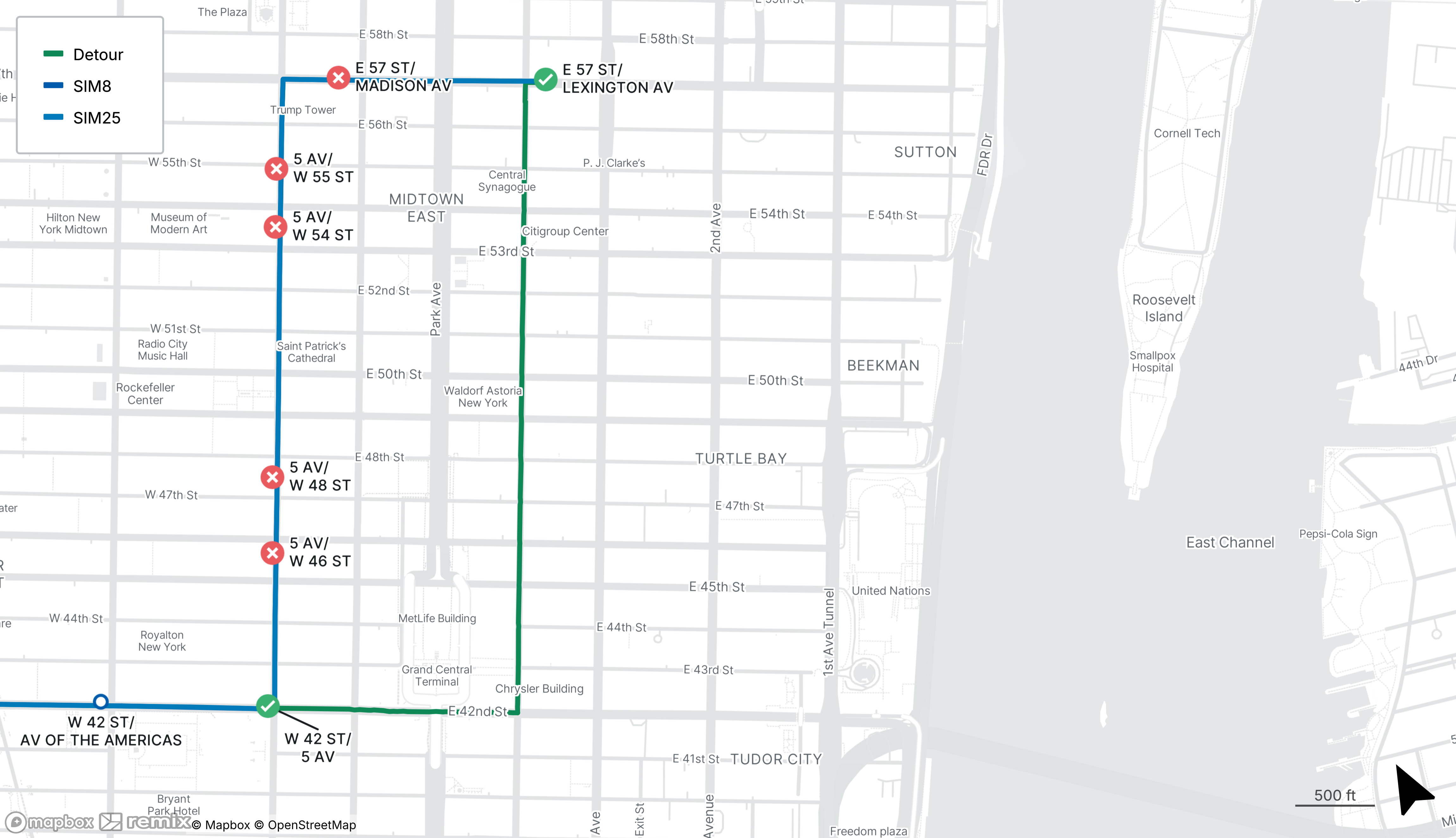 Southbound SIM8 and SIM25 stops on E 57th St at Madison Ave and 5th Ave from E 55th St to E46th St will be closed