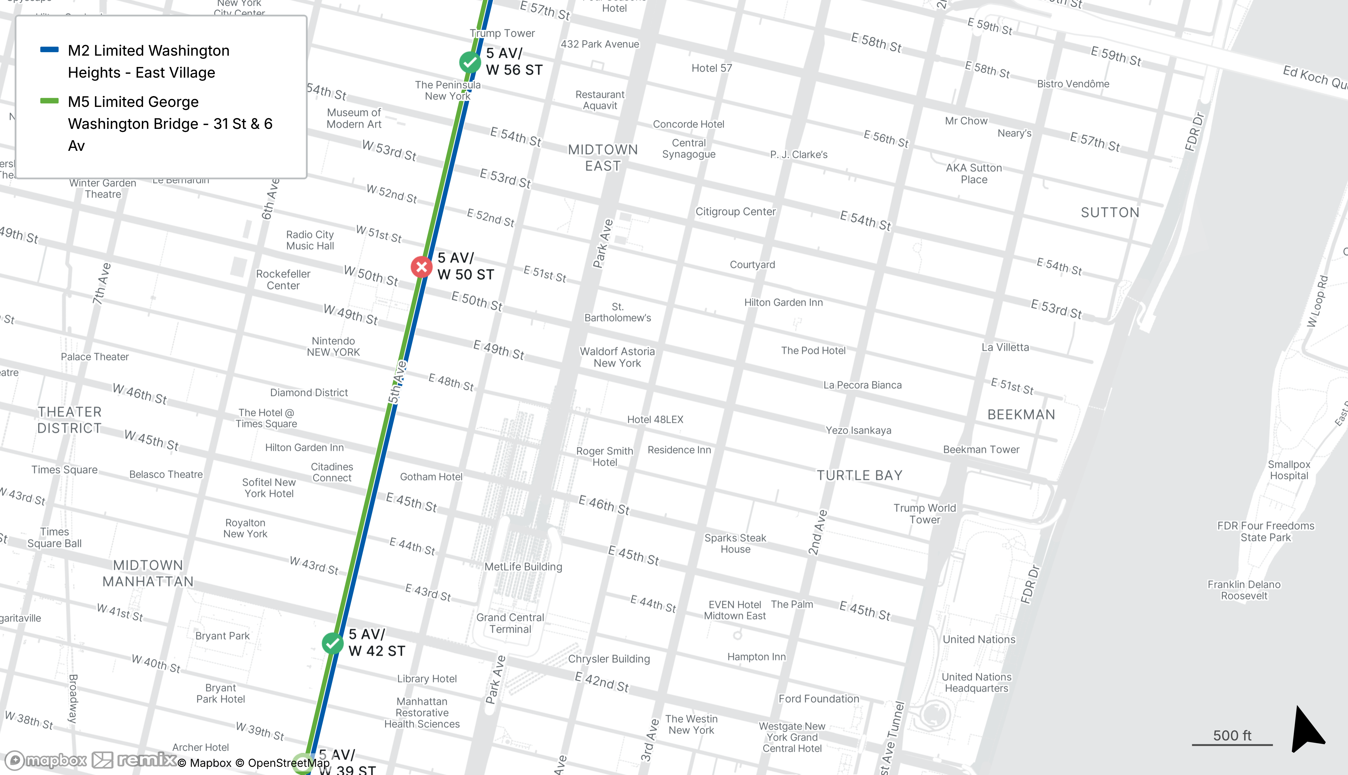 Southbound M2 limited and M5 limited bypass the stop on 5th Ave at W 50th St- use the stops on 5th Ave at W 56th St or W 42nd St