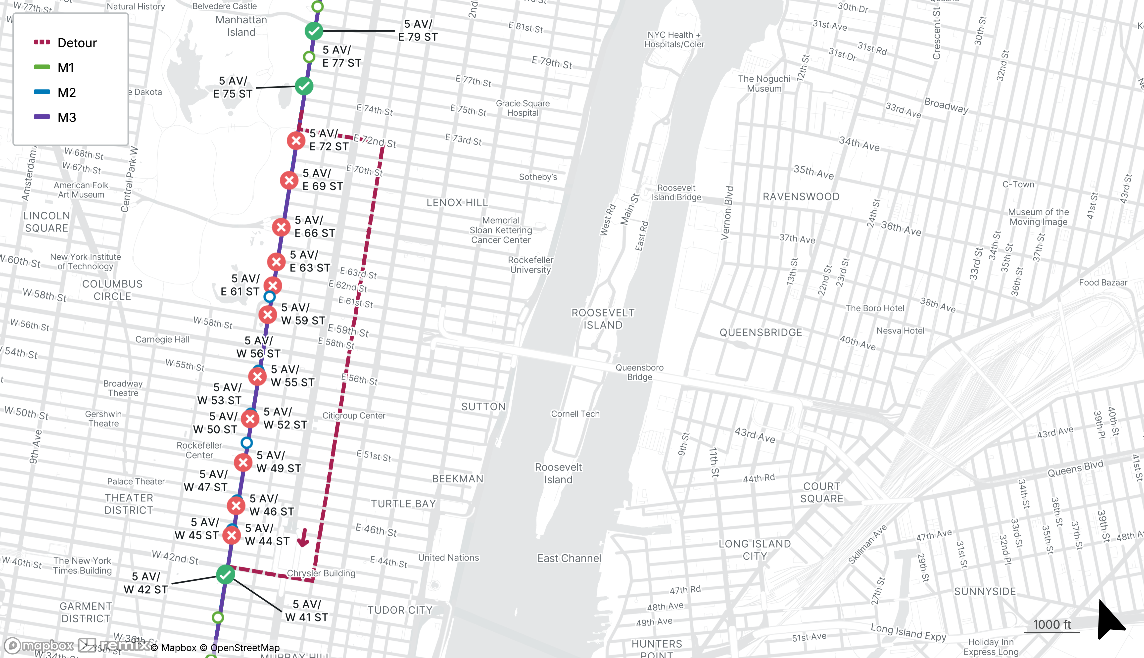 Southbound M1, M2, and M3 stops along 5th Ave from W 72nd St to W 44th St will be closed