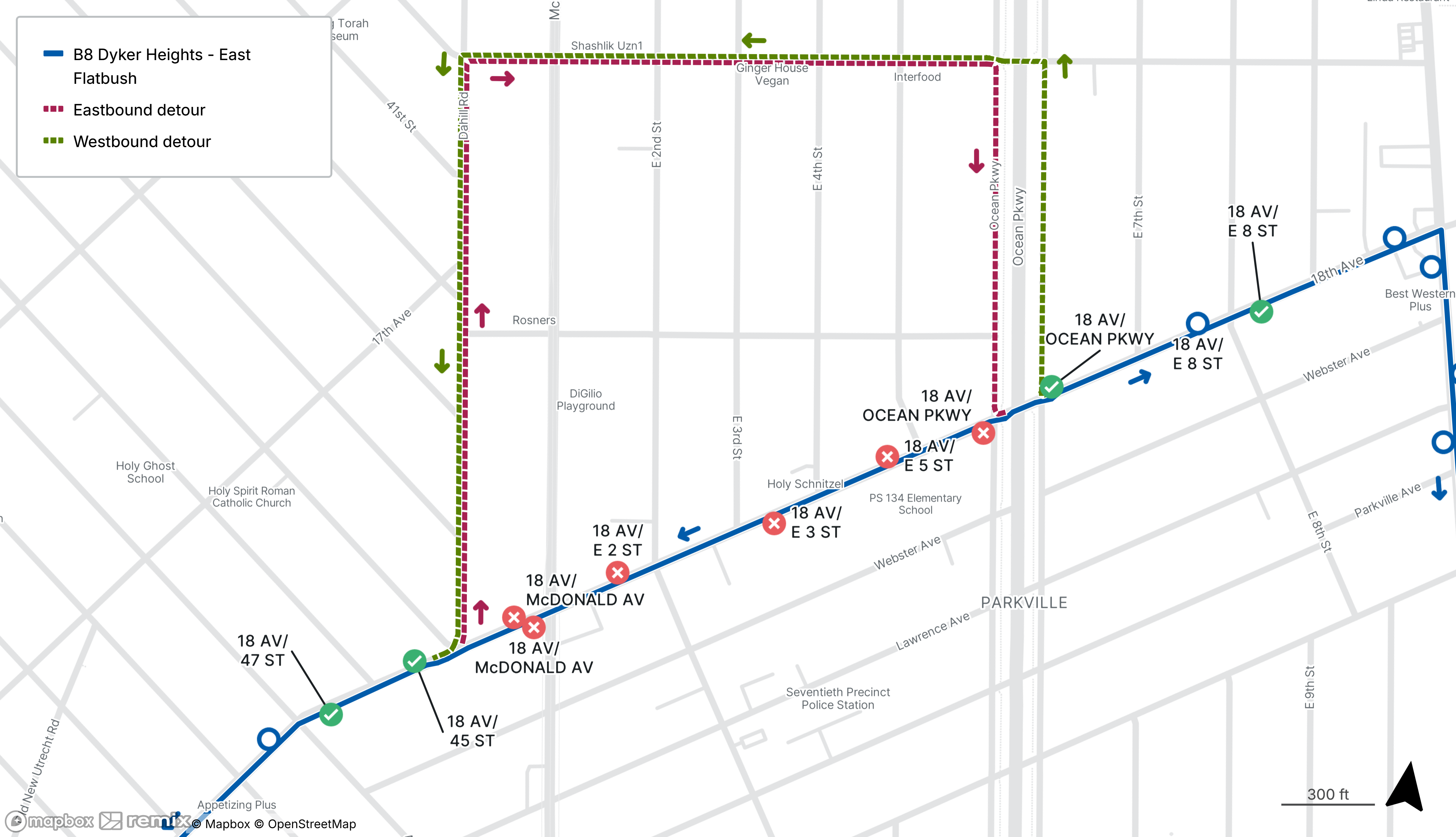 B8 buses will be detoured from 18th Ave between Ocean Parkway and Dahill Rd