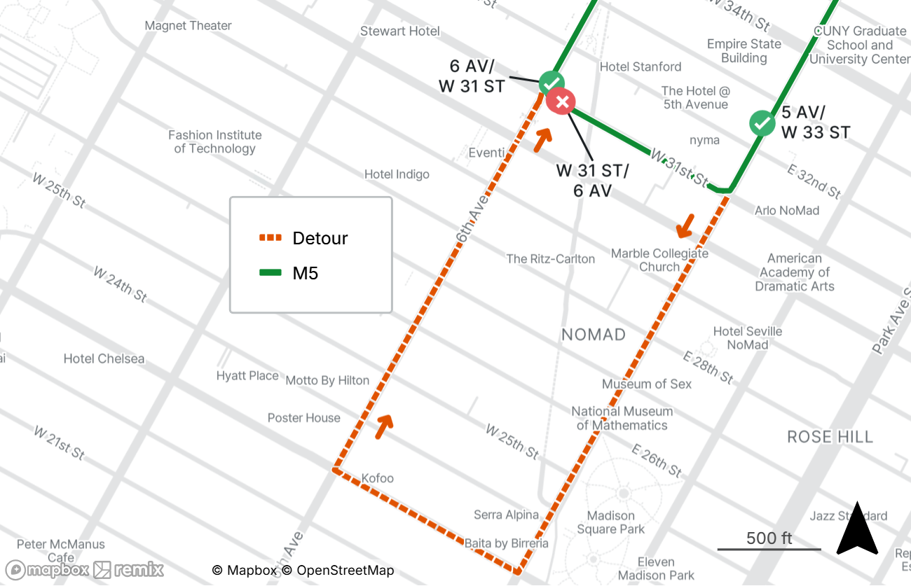 Southbound customers may ride through the detour to 6th Ave at W 31st St.