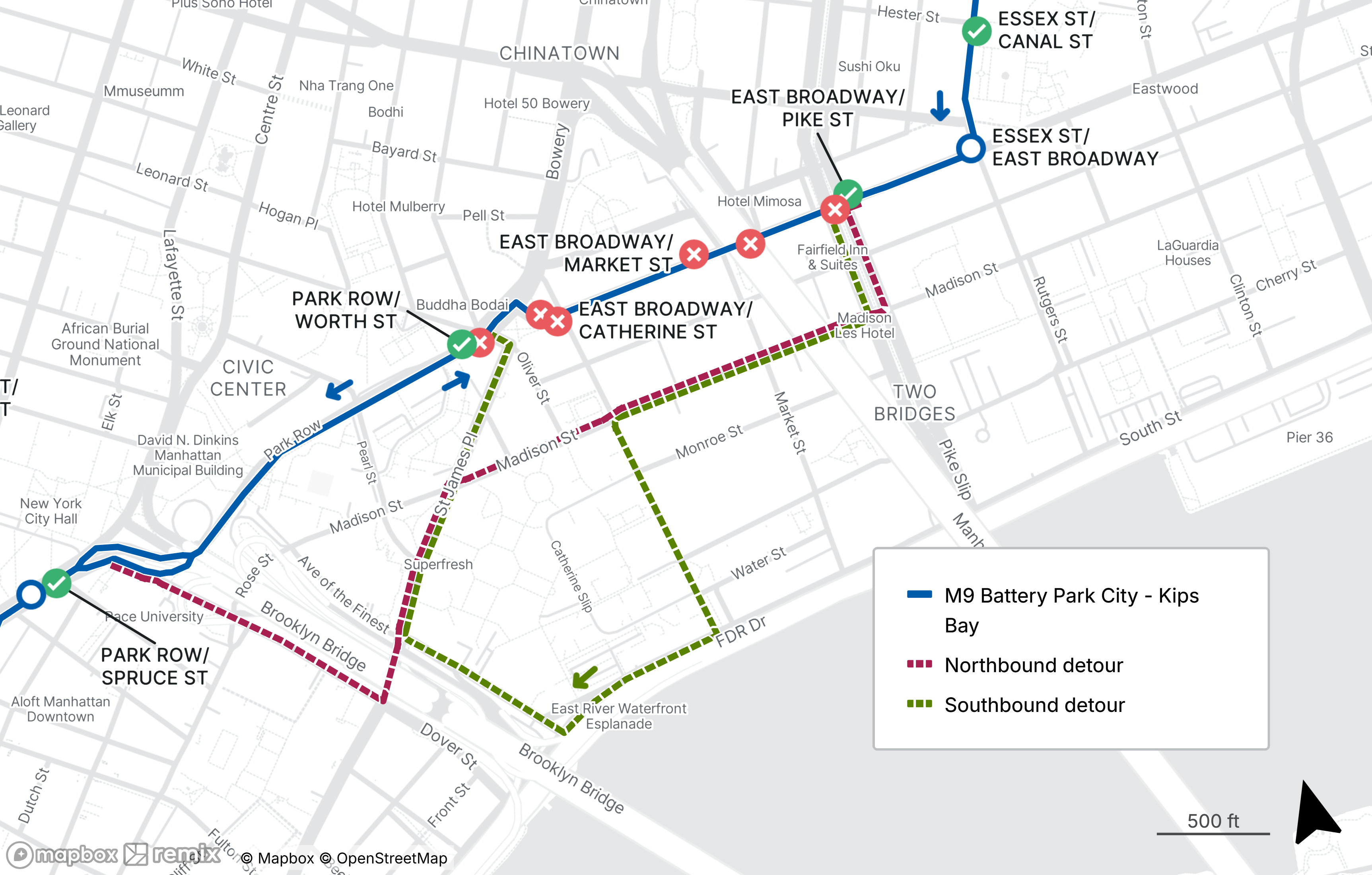 M9 buses will be detoured between Park Row and E Broadway at Pike St