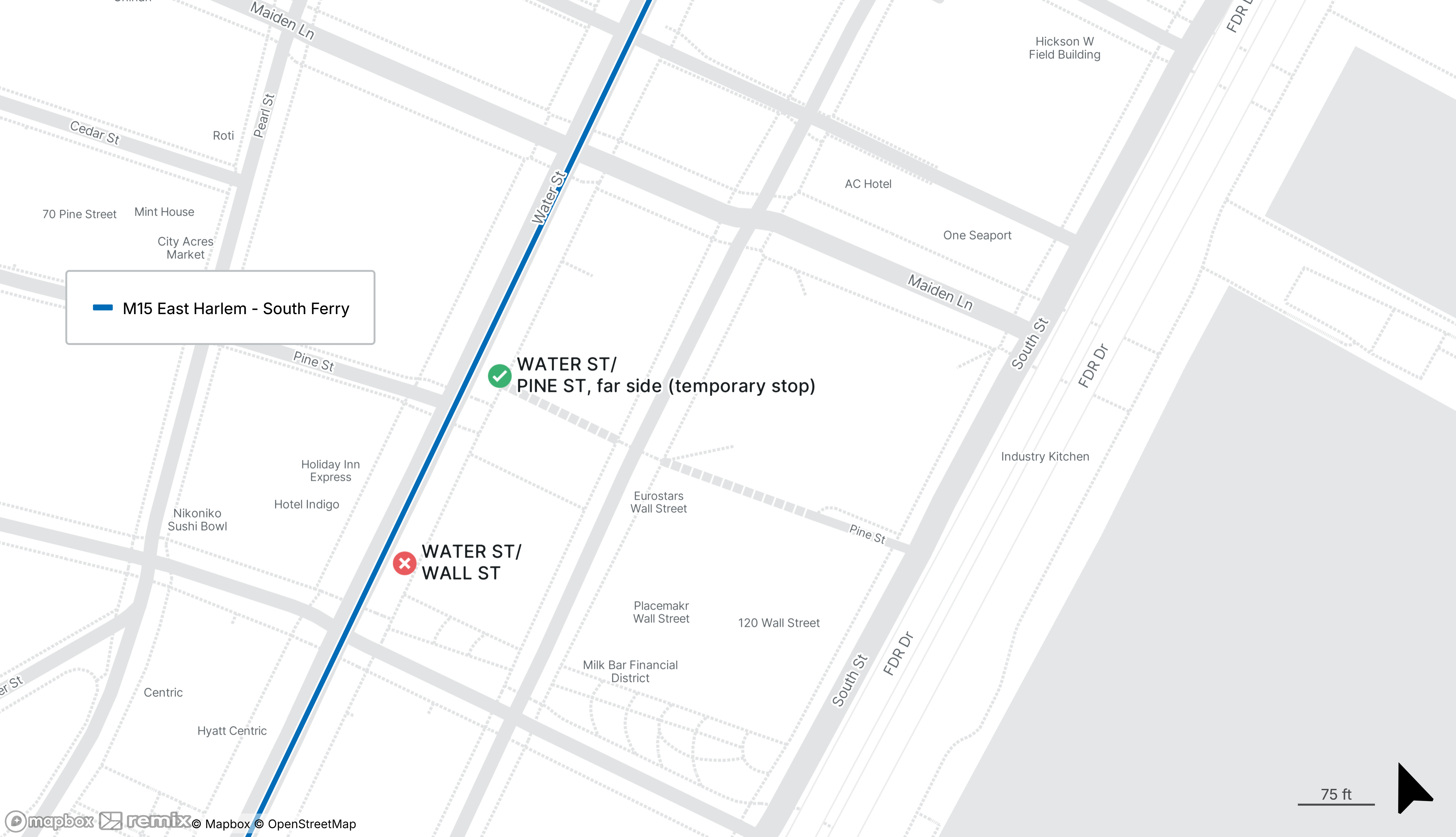 Northbound M15 stop on Water St at Wall St is closed, buses make a temporary stop across the intersection on Water St at Pine St