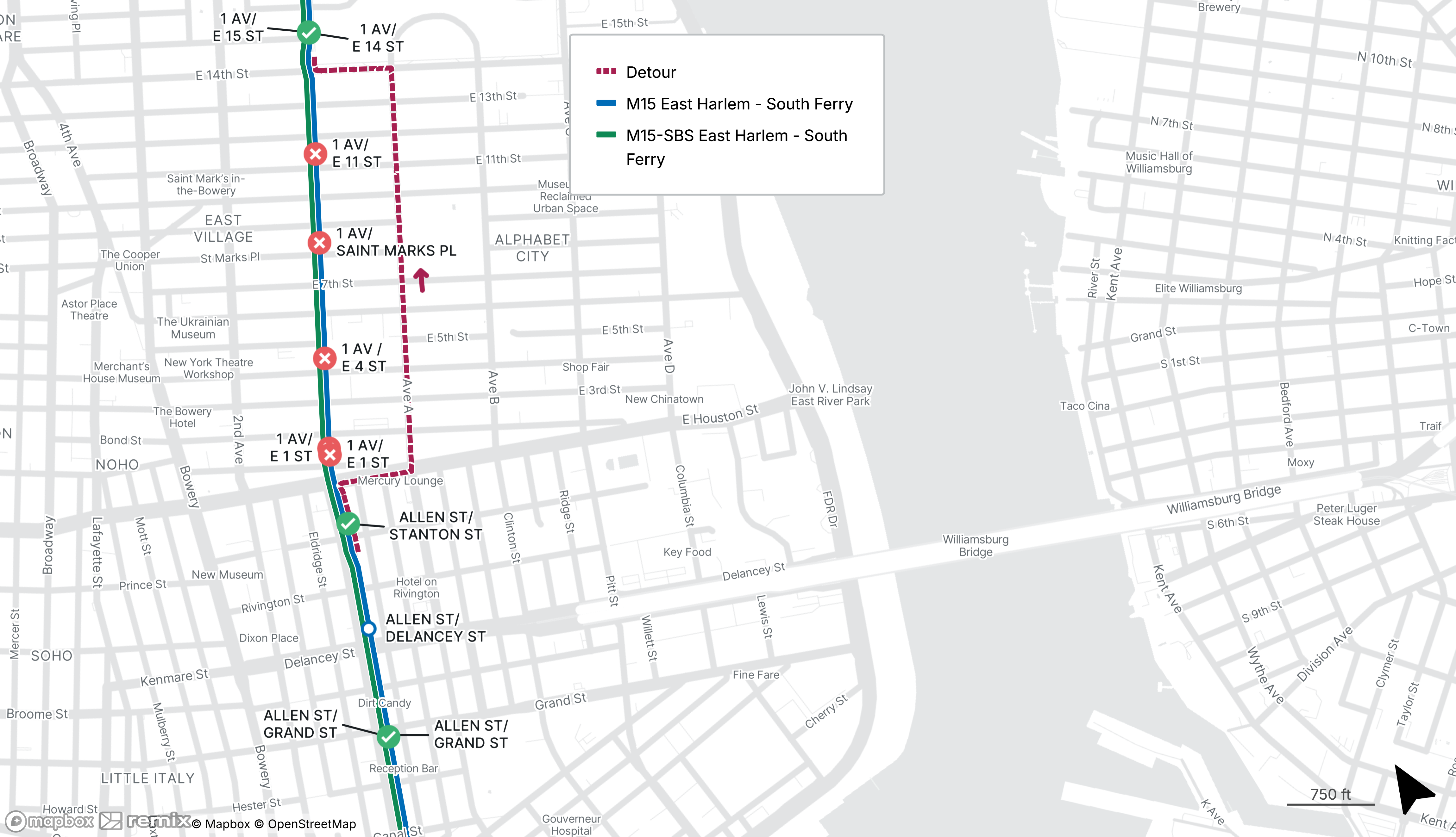 Northbound M15 and M15-SBS stops on 1st Ave from E 1st St to E 11th St will be closed