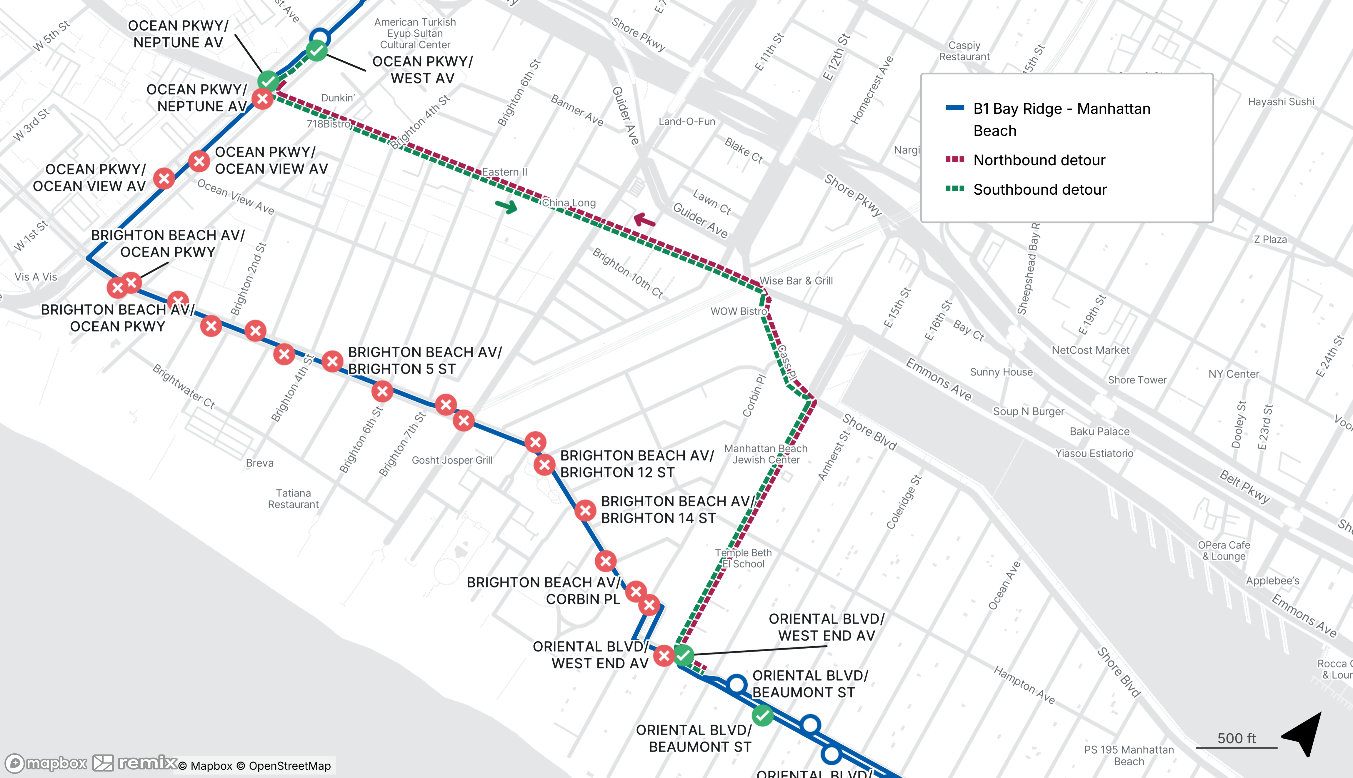 B1 buses will be detoured between Oriental Blvd at West End Ave and Ocean Parkway at Neptune Ave
