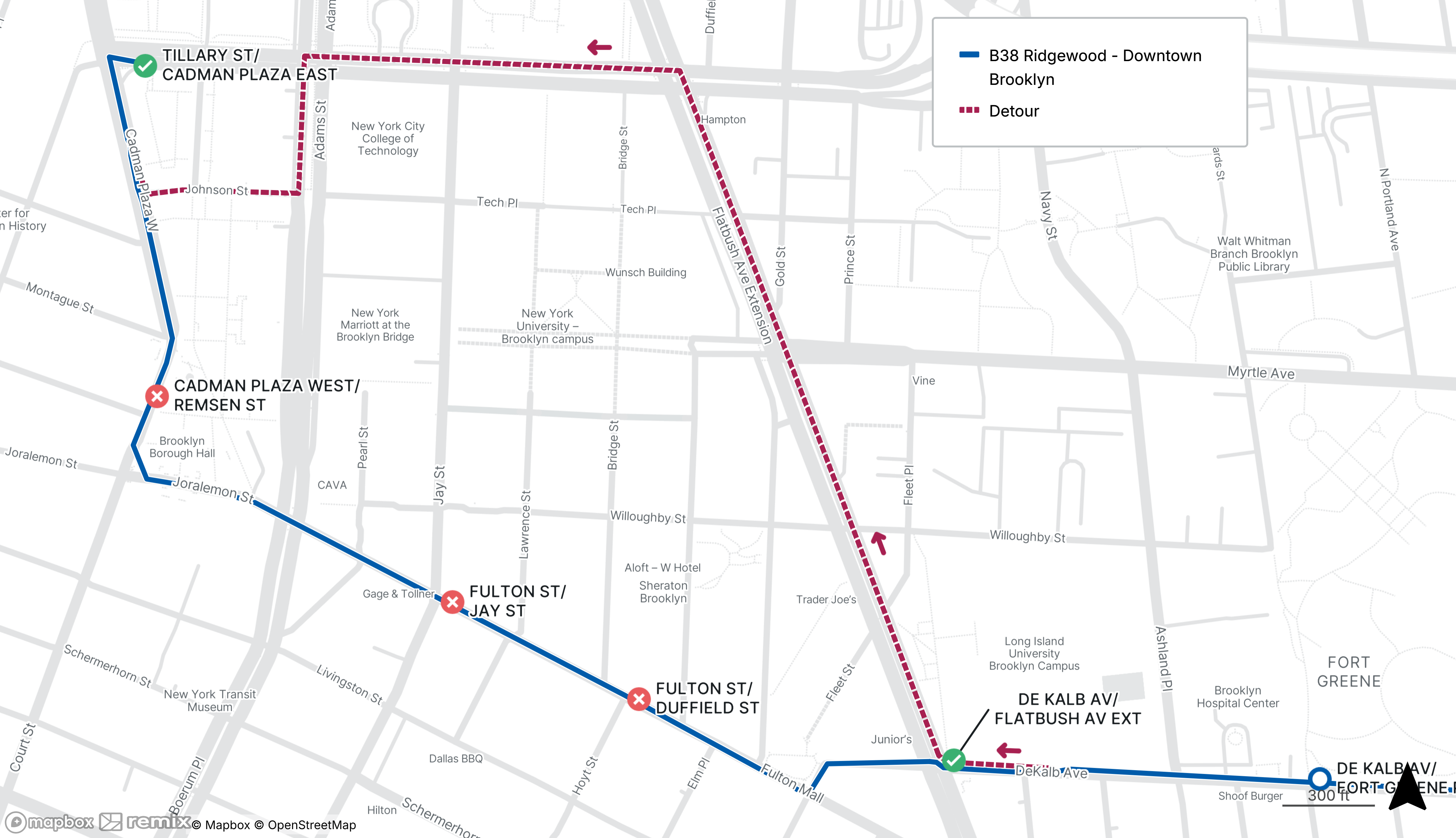 Westbound B38 stops on Fulton St at Duffield St and Jay St, and on Cadman Plaza West at Remsen St will be closed