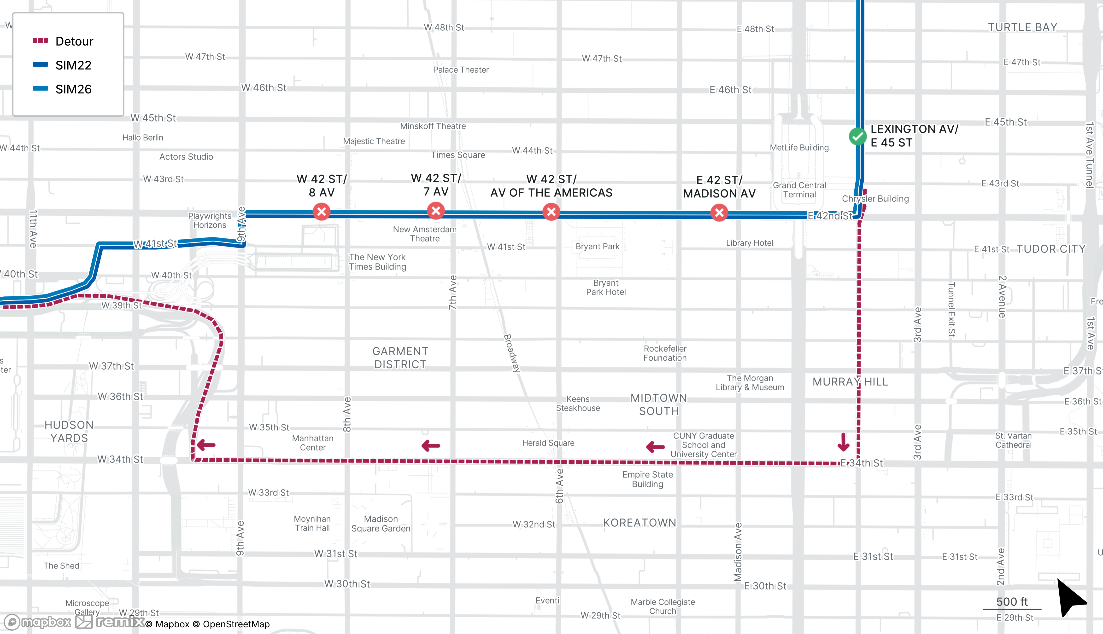 Southbound SIM22 and SIM26 stops on 42nd St from Madison Ave to 8th Ave will be closed