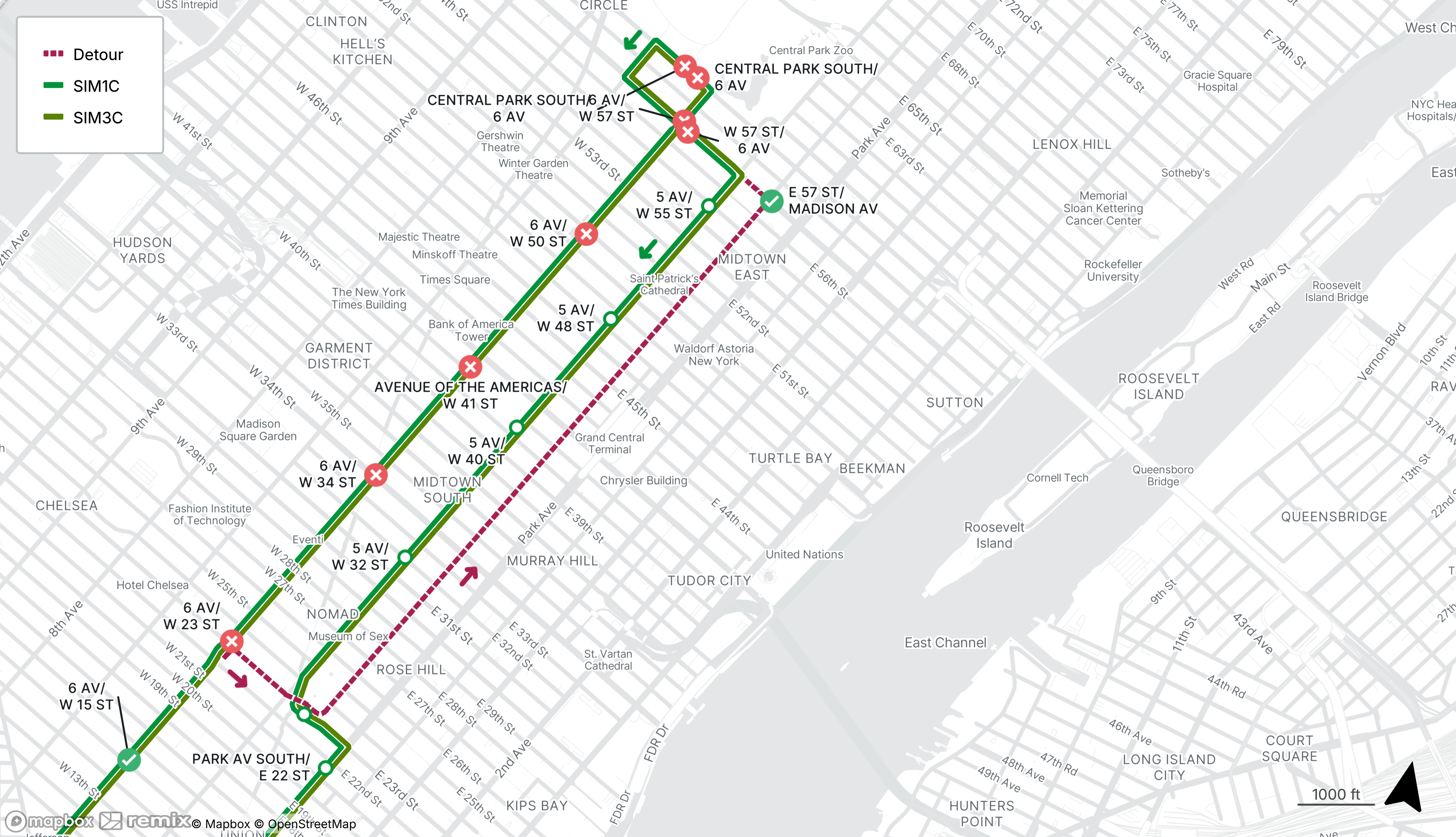 SIM1C and SIM3C buses will be detoured between E 57th St at Madison Ave and E 23rd St at Madison Ave