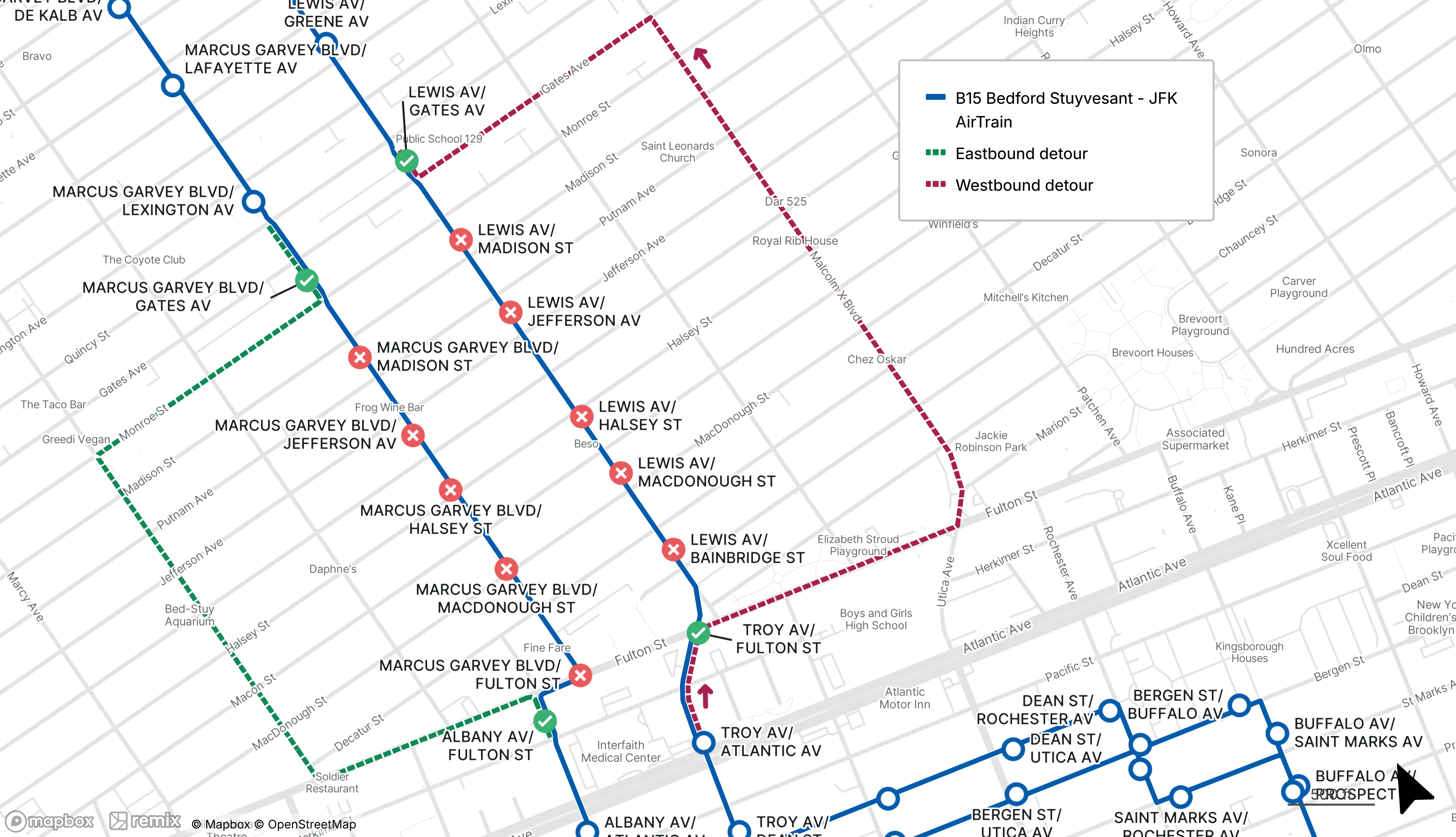 B15 buses will be detoured between Marcus Garvey Blvd at Gates Ave and Troy Ave at Fulton St