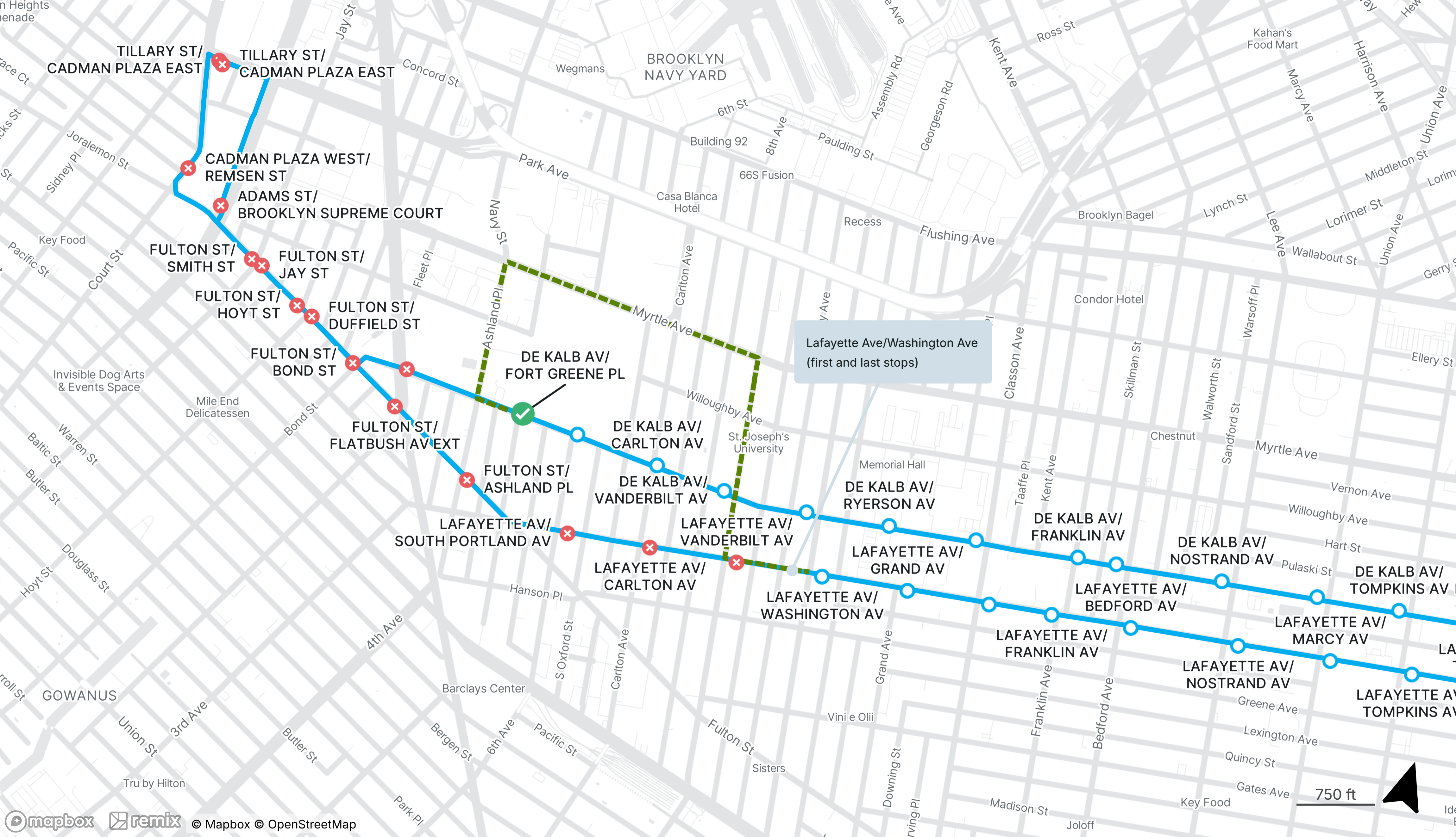 Starts Sun Apr 26 Until Sun Apr 26The last westbound stop will be made on DeKalb Ave at Ft Greene Pl.