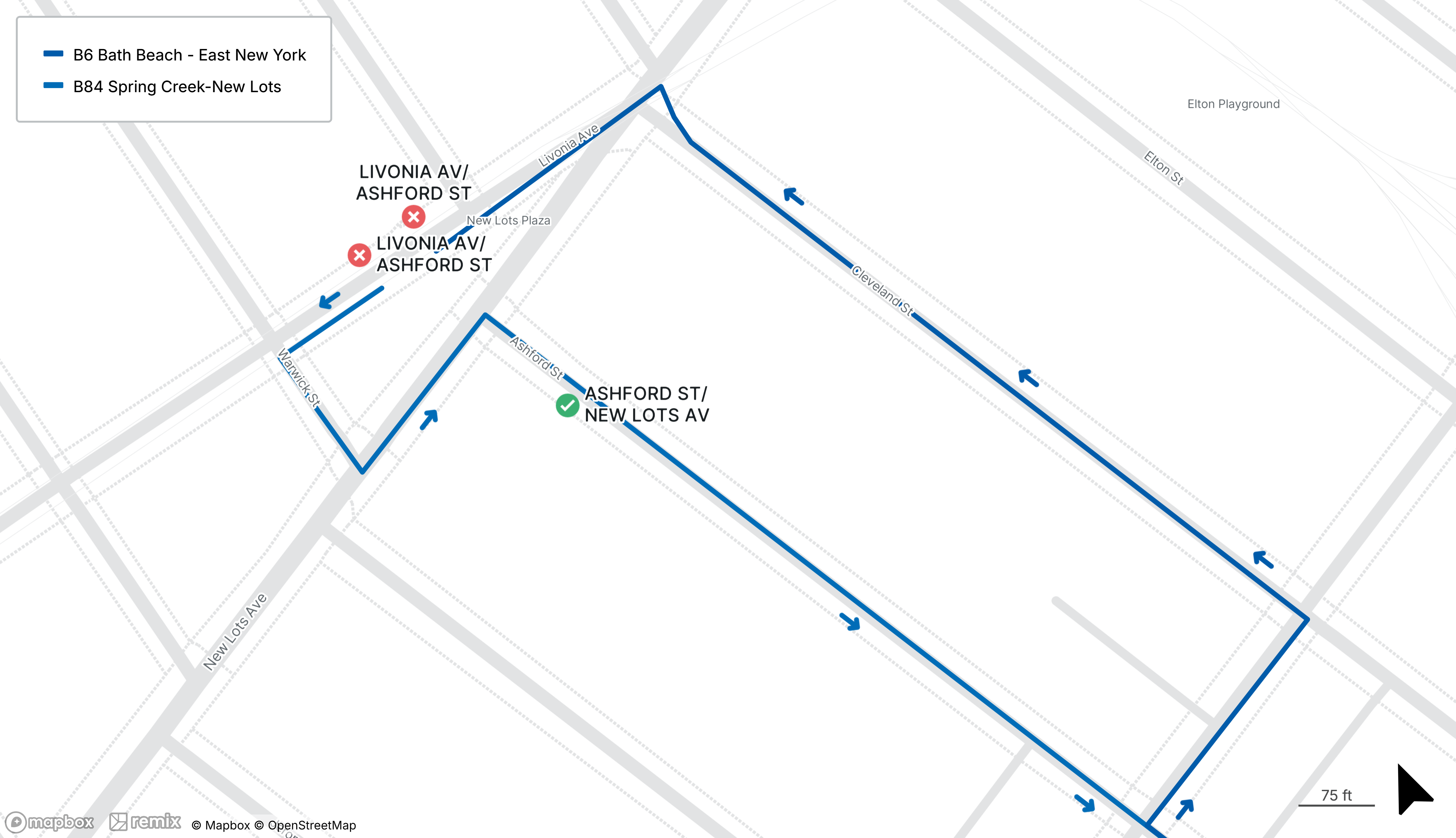 Eastbound B6 and B84 stops on Livonia Ave at Ashford St are closed, use the stop on Ashford St at New Lots Ave