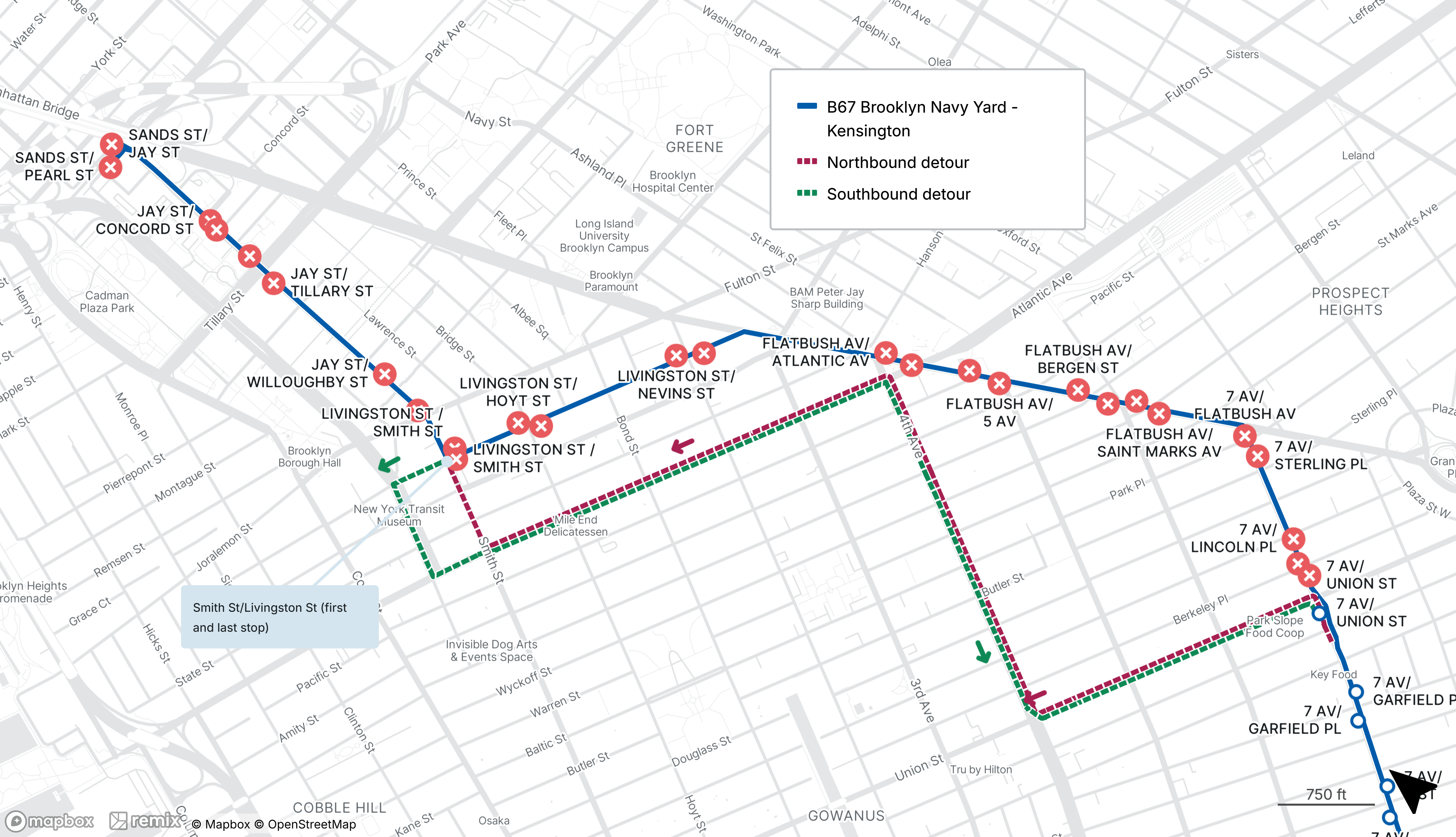 No B67 service between Union St at 7th Ave and Sands St at Jay St