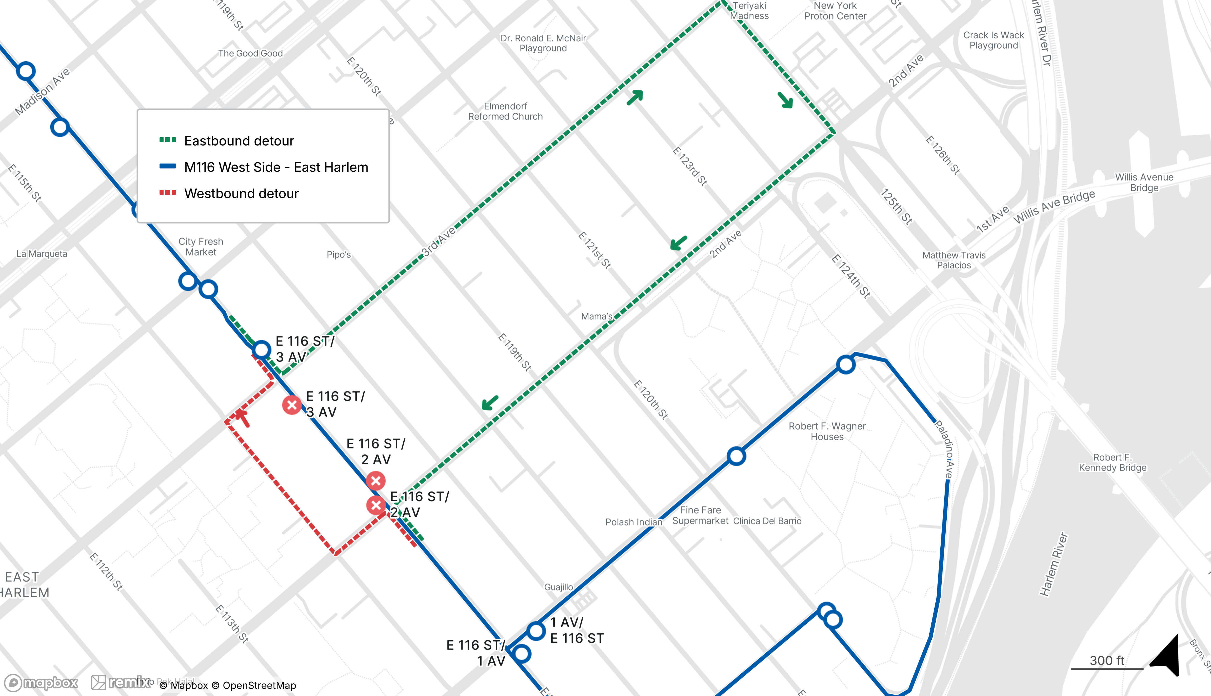 M116 buses will be detoured from 116th St between 2nd Ave and 3rd Ave