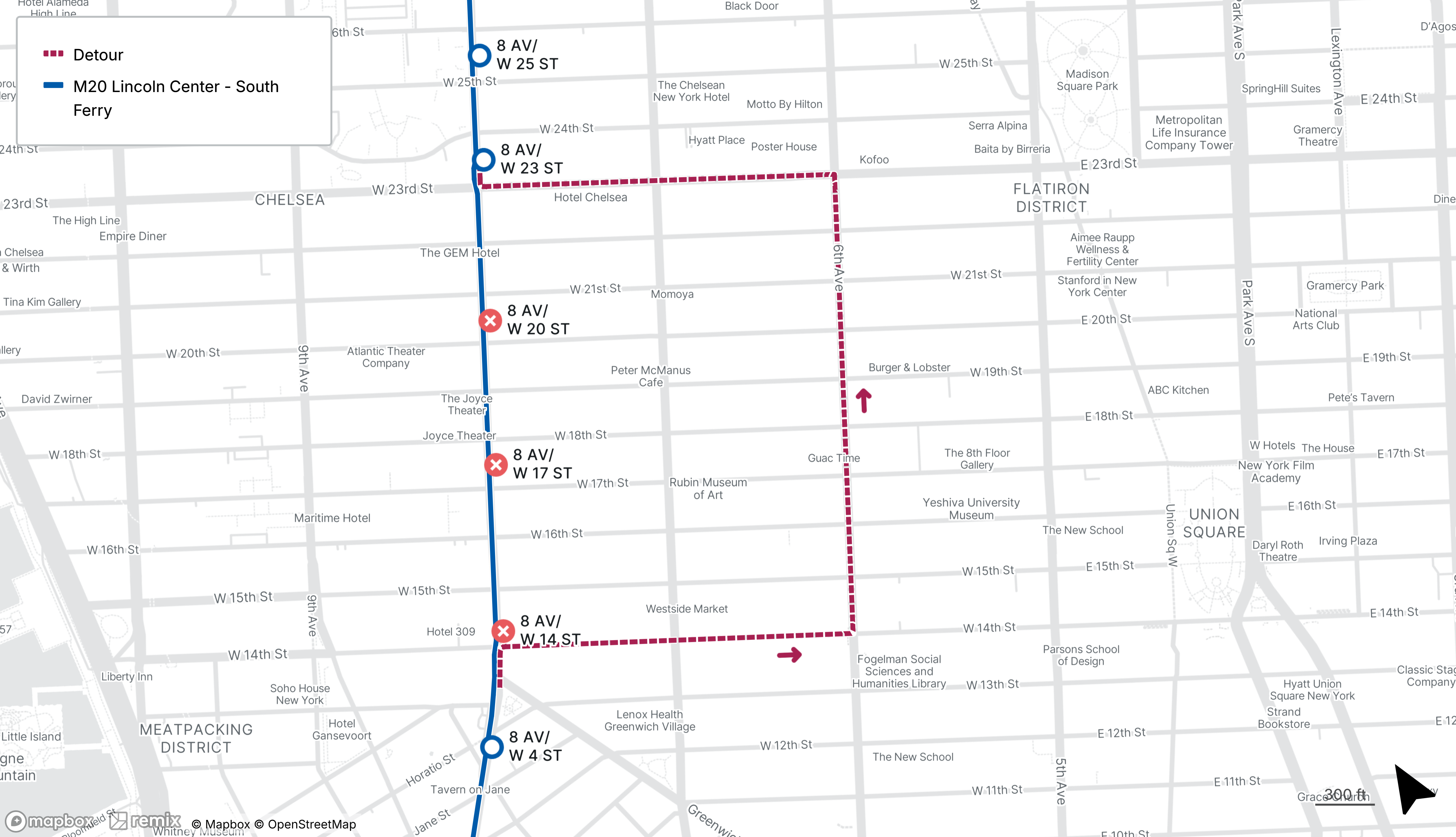 Northbound M20 stops on 8th Ave from W 14th St to W 20th St will be closed