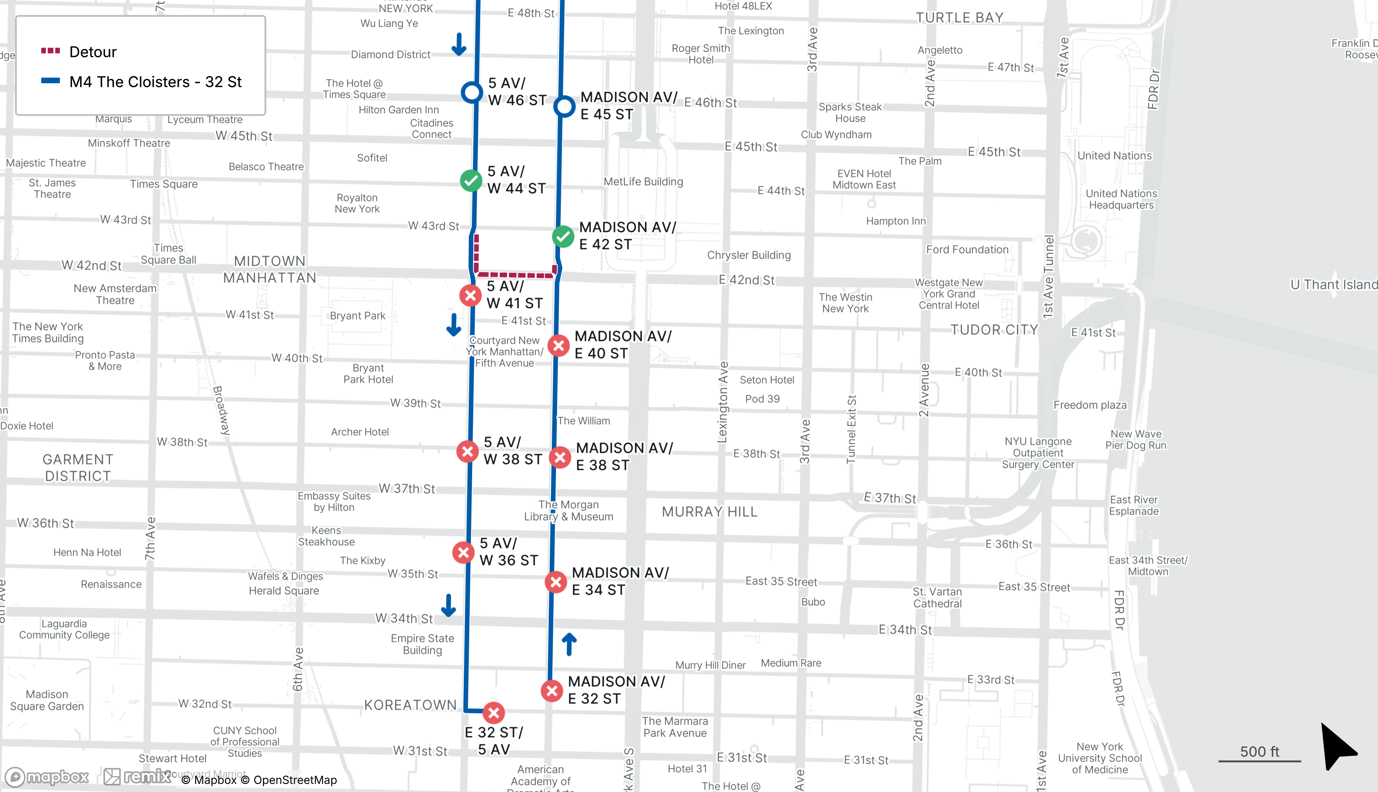 Southbound buses operate via 5th Ave, E 42nd St and Madison Ave