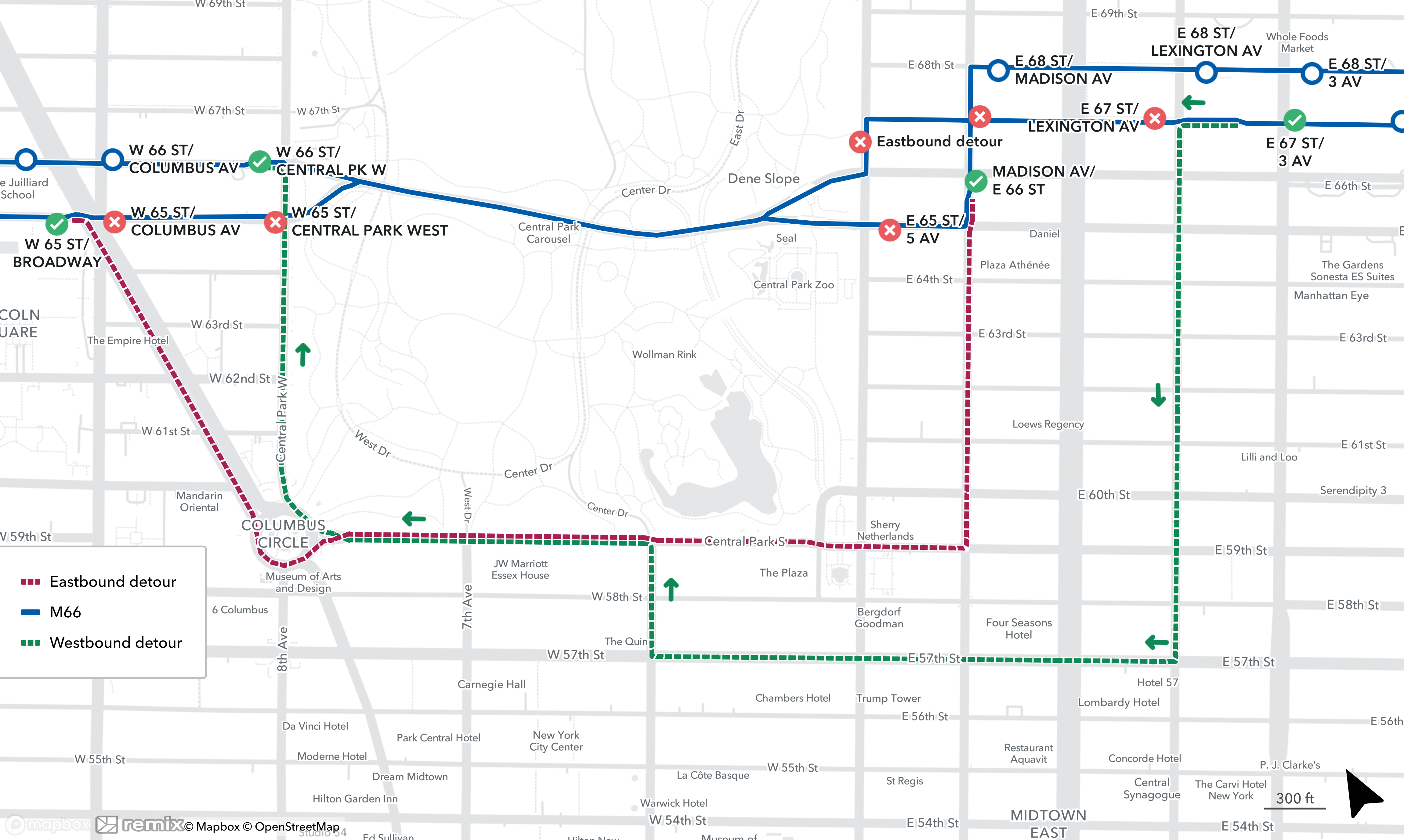 M66 buses will be detoured between E 67th St at Lexington Ave and W 65th St at Broadway