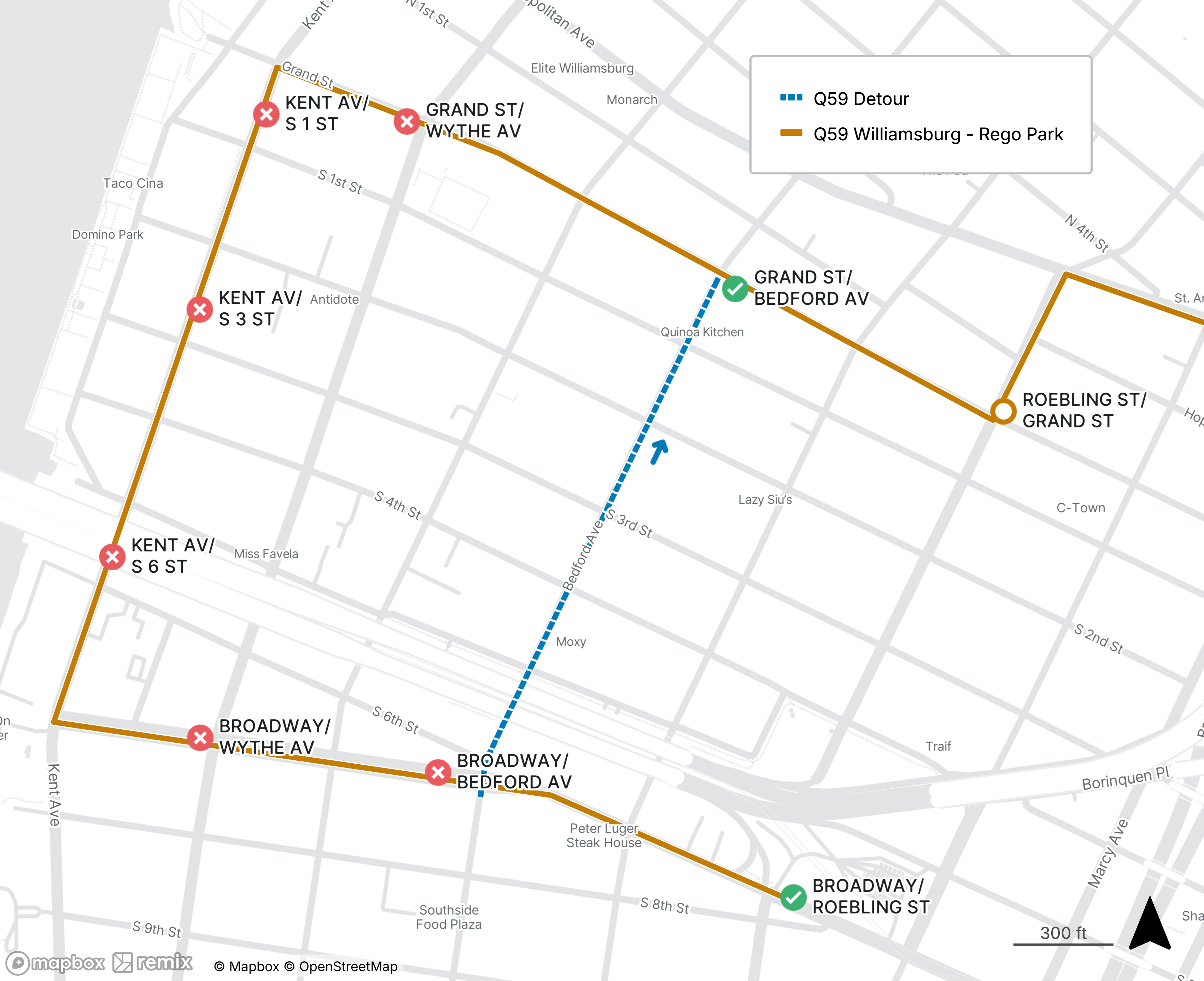 Eastbound Q59 buses will be detoured along Bedford Ave at Broadway to Grand St
