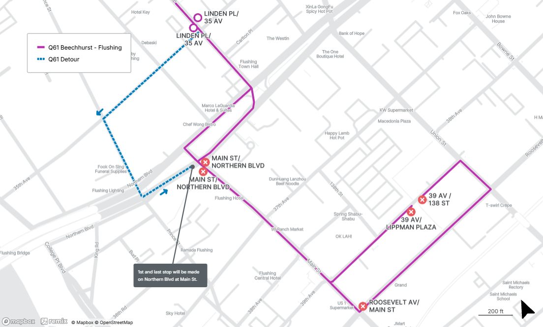 Northbound Q61 stop on Linden Pl at 35th Ave is closed, use the temporary stop on Linden Pl at Northern Blvd