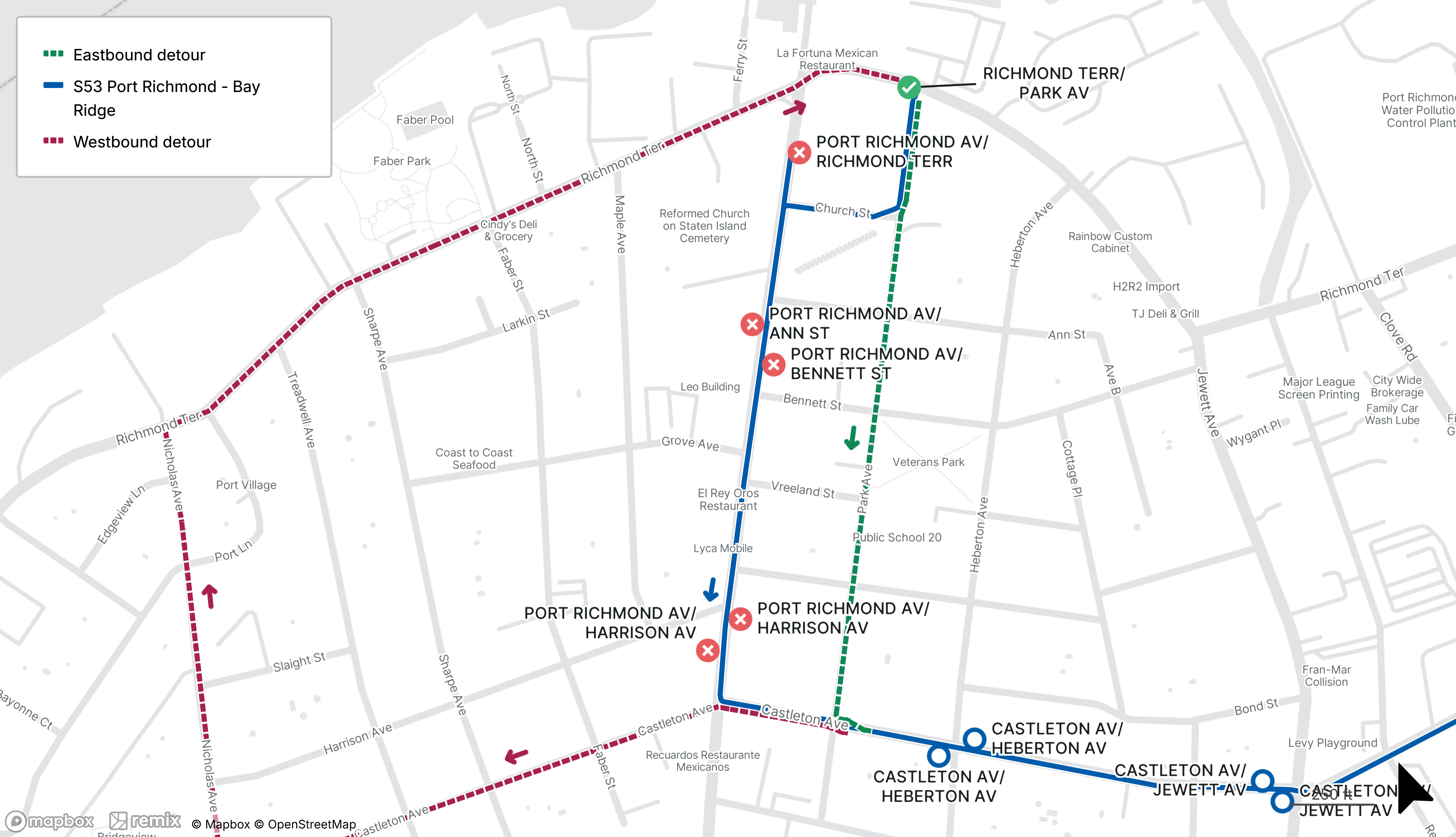 S53 buses will be detoured between Richmond Terrace at Park Ave and Castleton Ave at Nicholas Ave