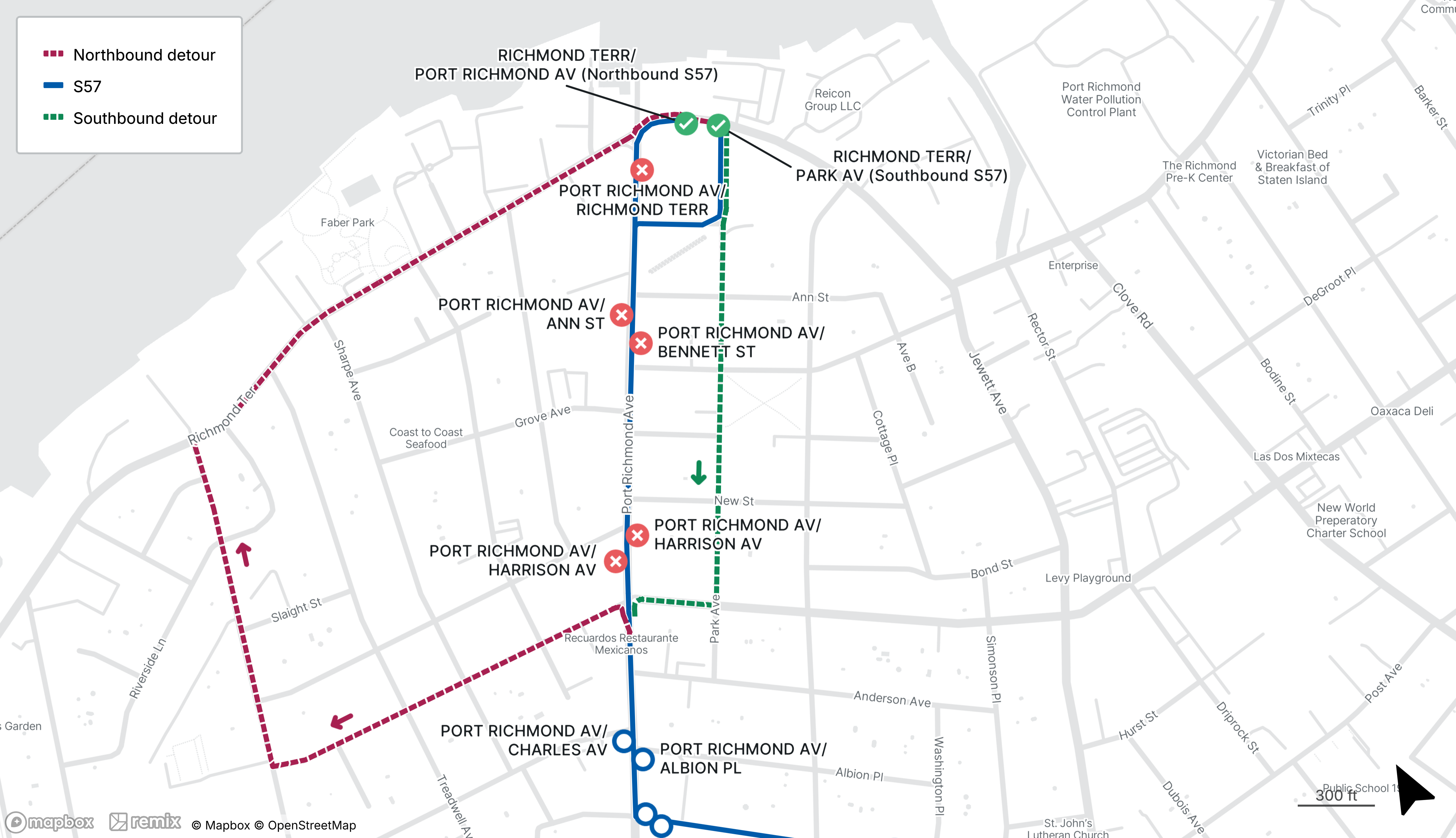 S57 buses will be detoured between Richmond Terrace at Park Ave and Castleton Ave at Port Richmond Ave