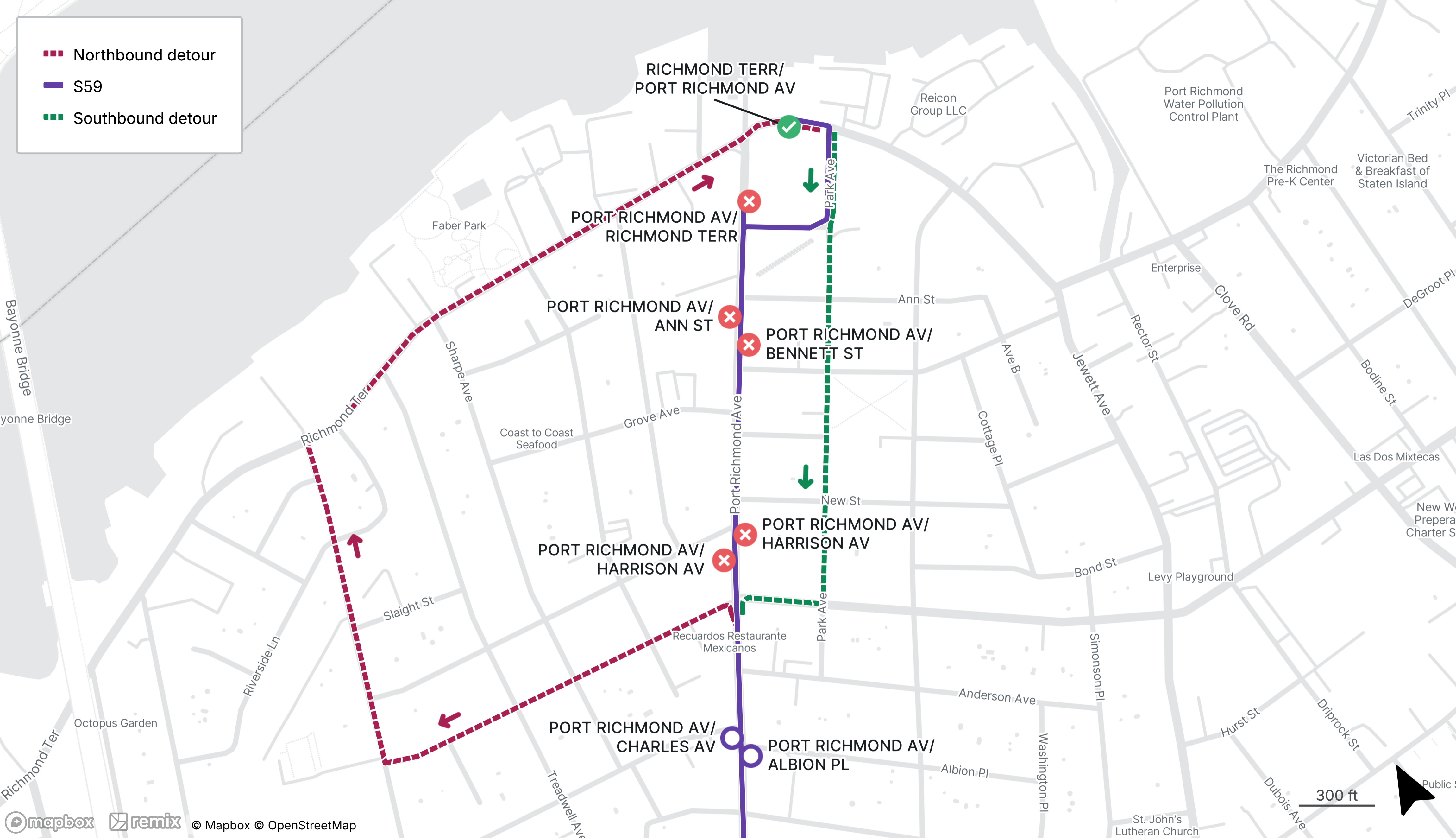 S59 buses will be detoured between Richmond Terrace at Park Ave and Castleton Ave at Port Richmond Ave
