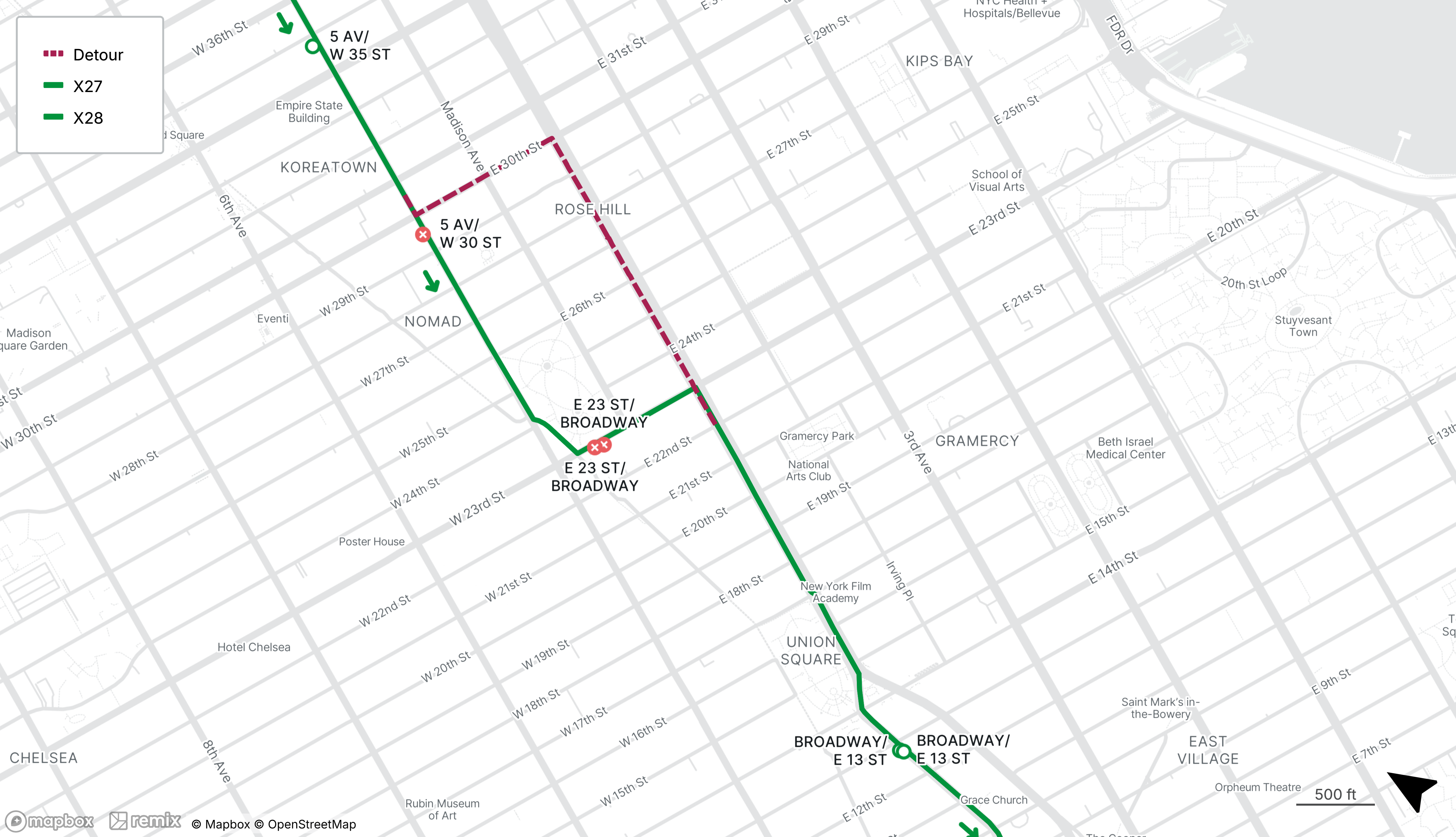 Southbound X27 and X28 stops on 5th Ave at W 30th St and E 23rd St at Broadway will be closed
