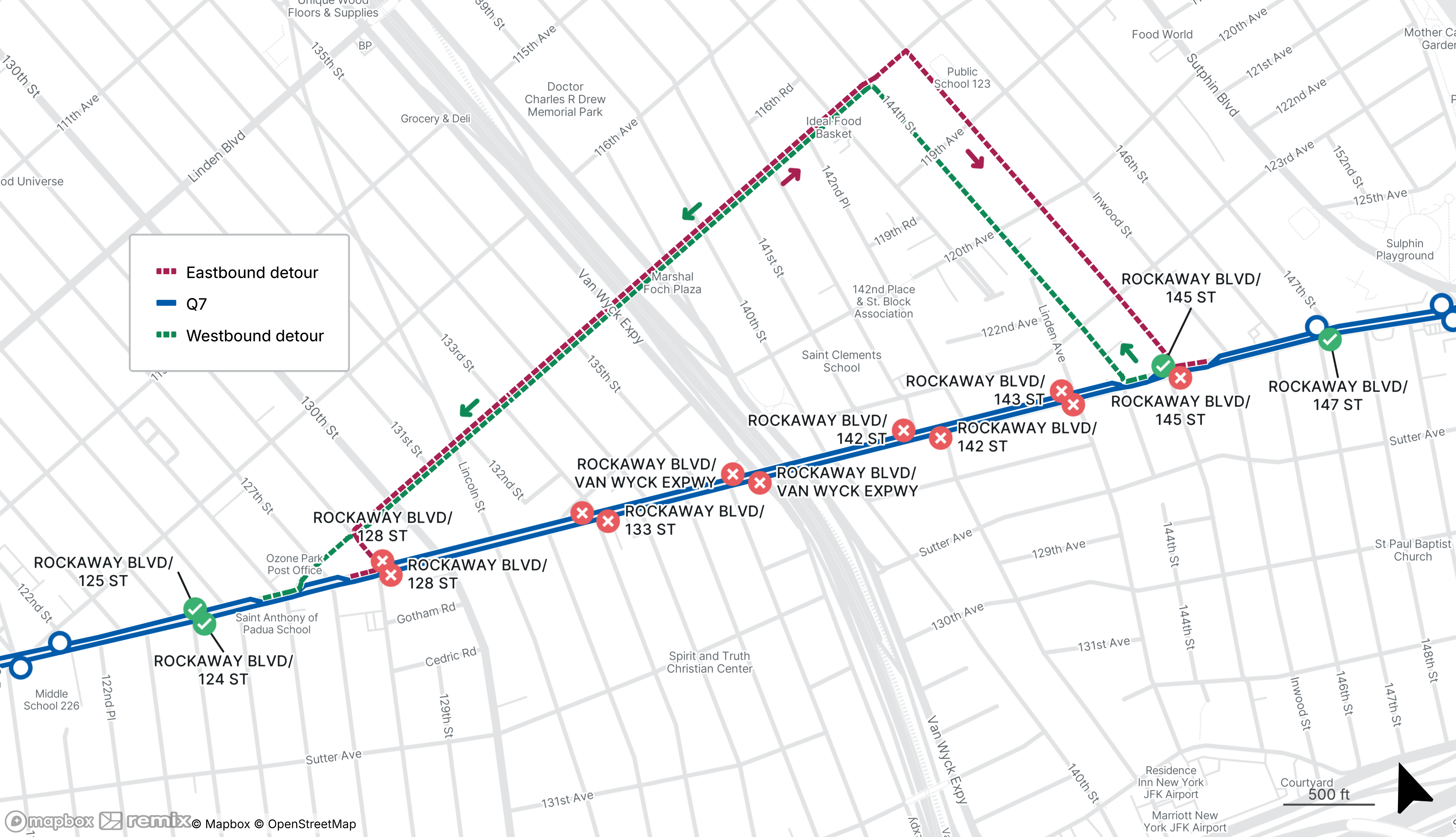Q7 buses will be detoured from Rockaway Blvd between 144th St and 128th St