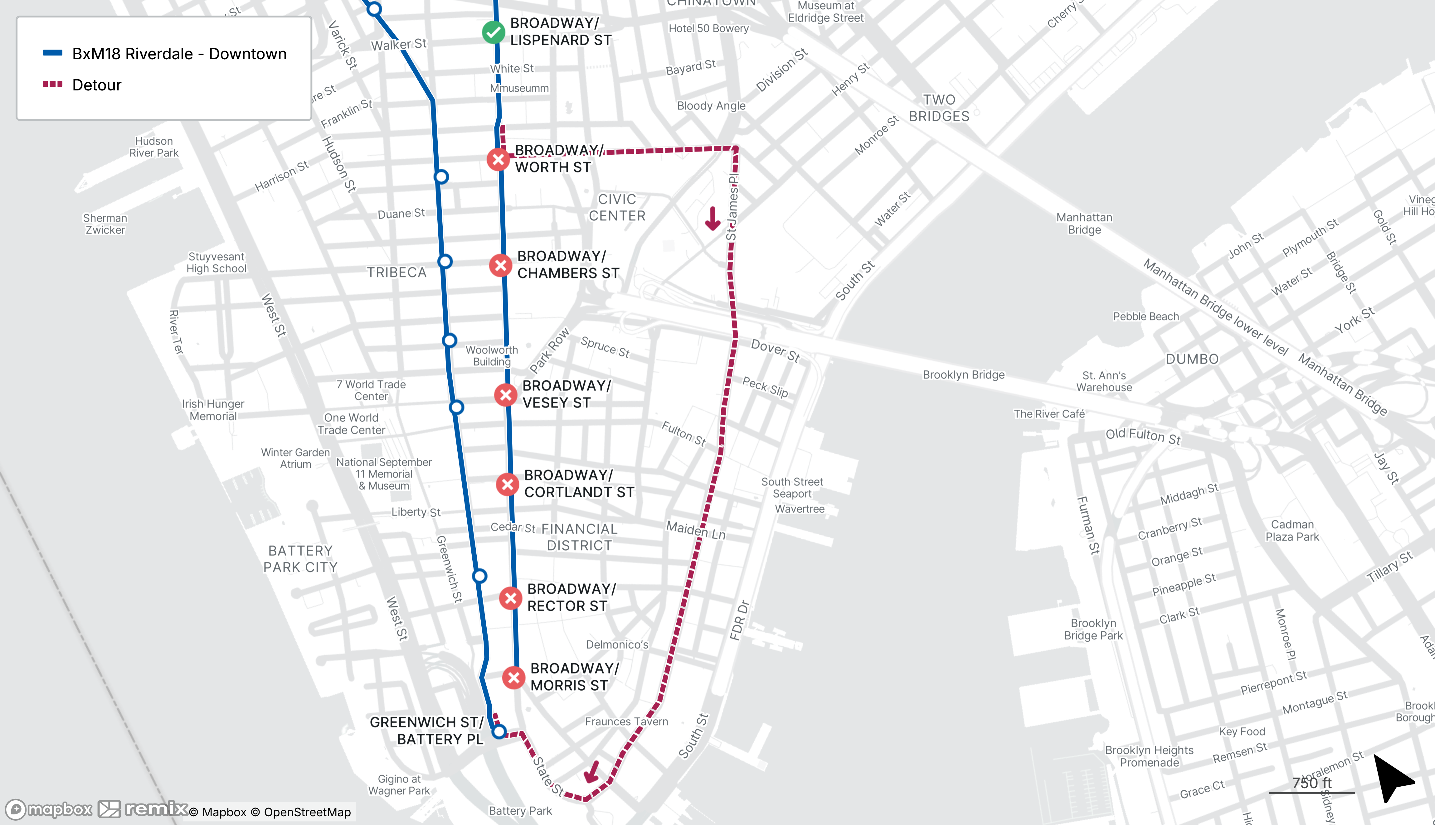 Southbound BxM18 stops on Broadway from Worth St to Morris St will be closed