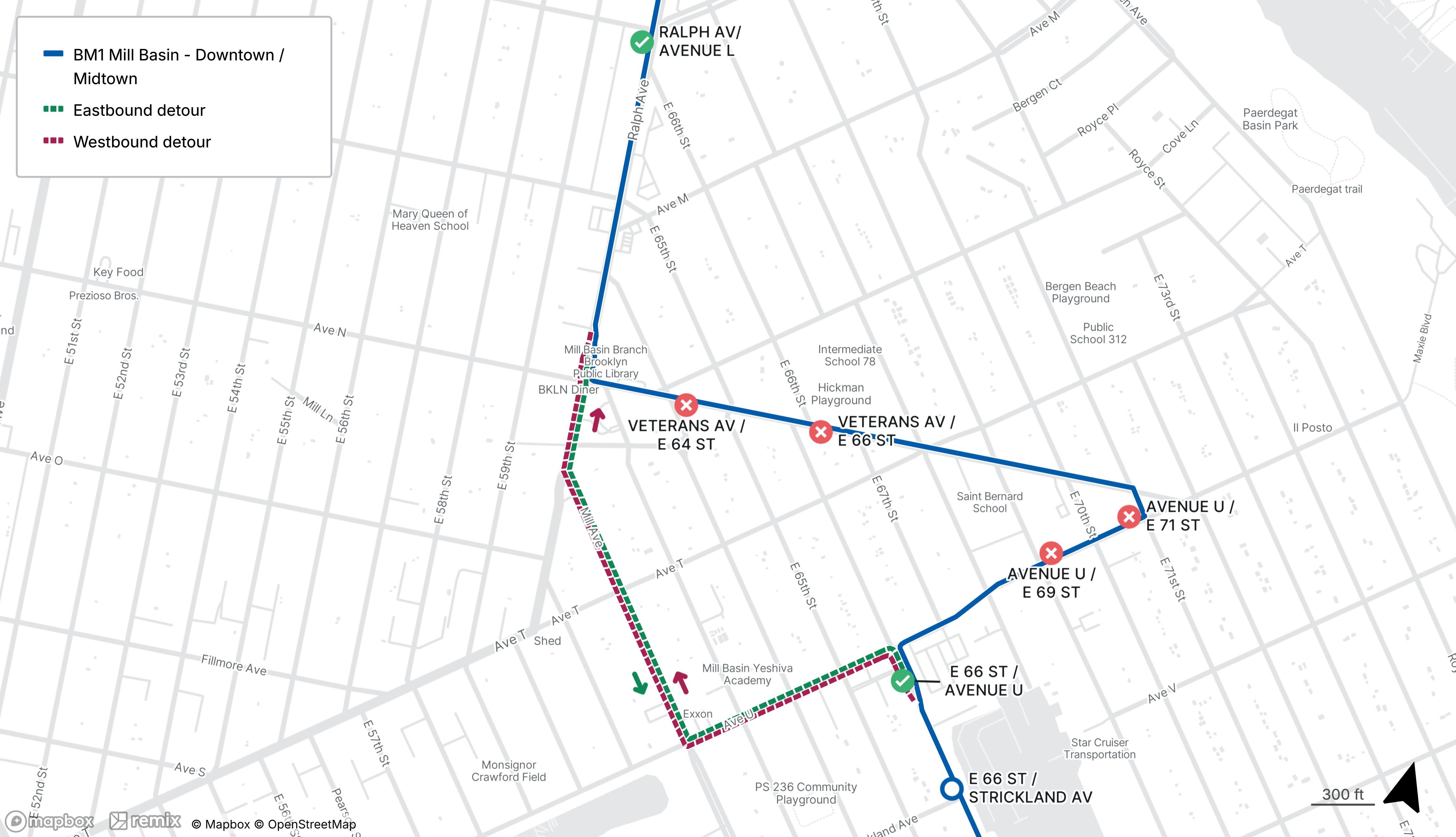 BM1 buses will be detoured between Ralph Ave at Mill Ave and E 66th St at Avenue U