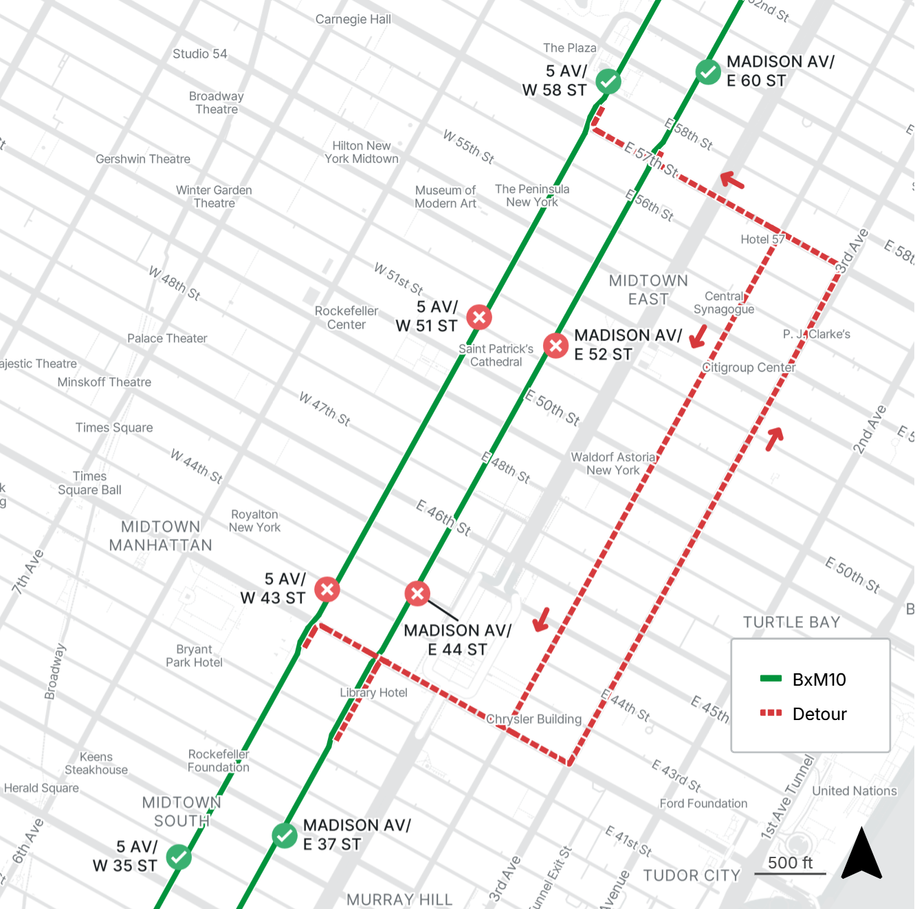 BxM10 northbound stops on Madison Ave at E 44th St and E 52nd St, and southbound stops on 5th Ave at W 51st St and W 43rd St are closed
