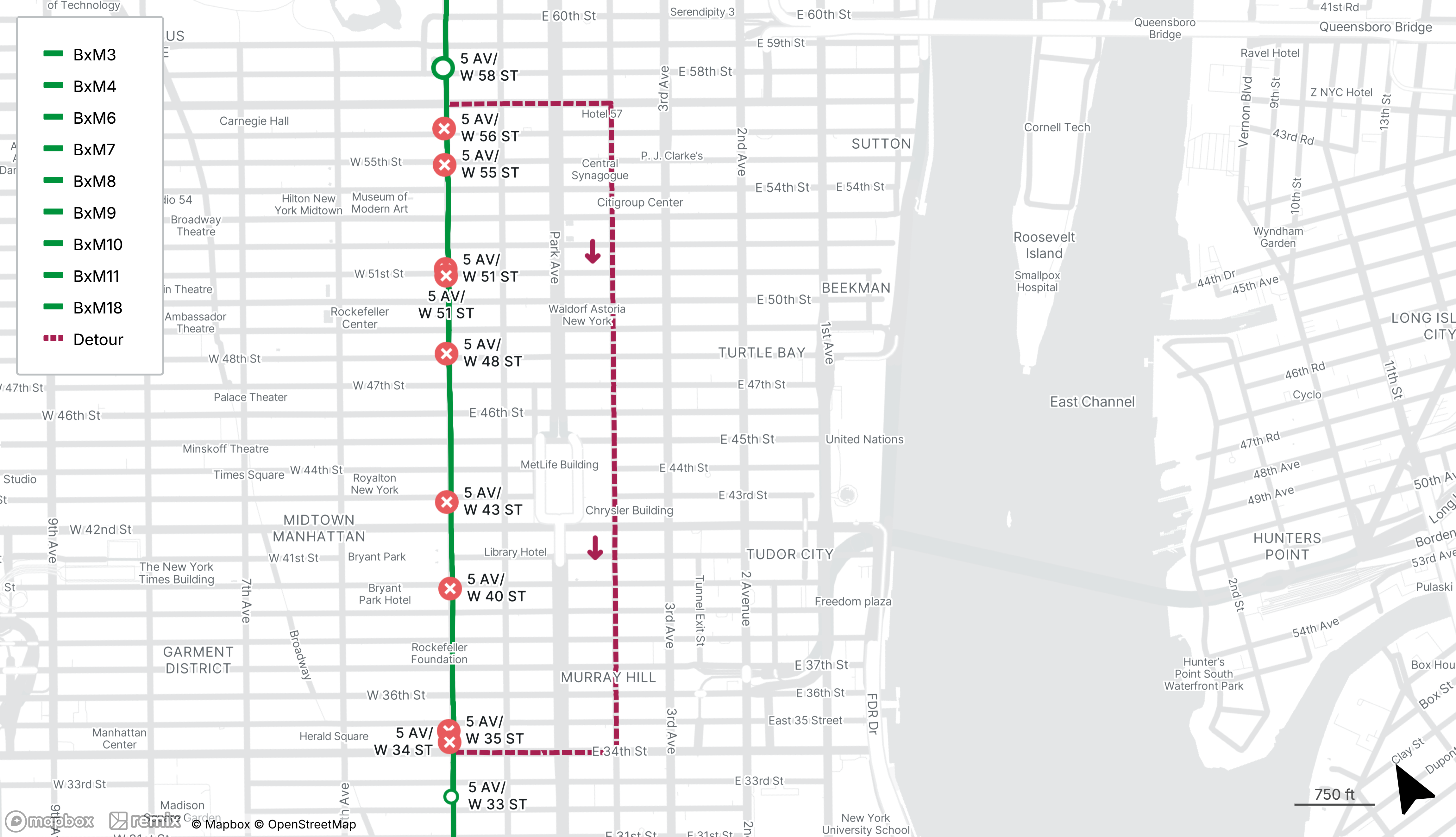Southbound BxM3, BxM4, BxM6, BxM7, BxM8, BxM9, BxM10, BxM11 and BxM18 stops on 5th Ave from W 56th St to W 34th St will be closed