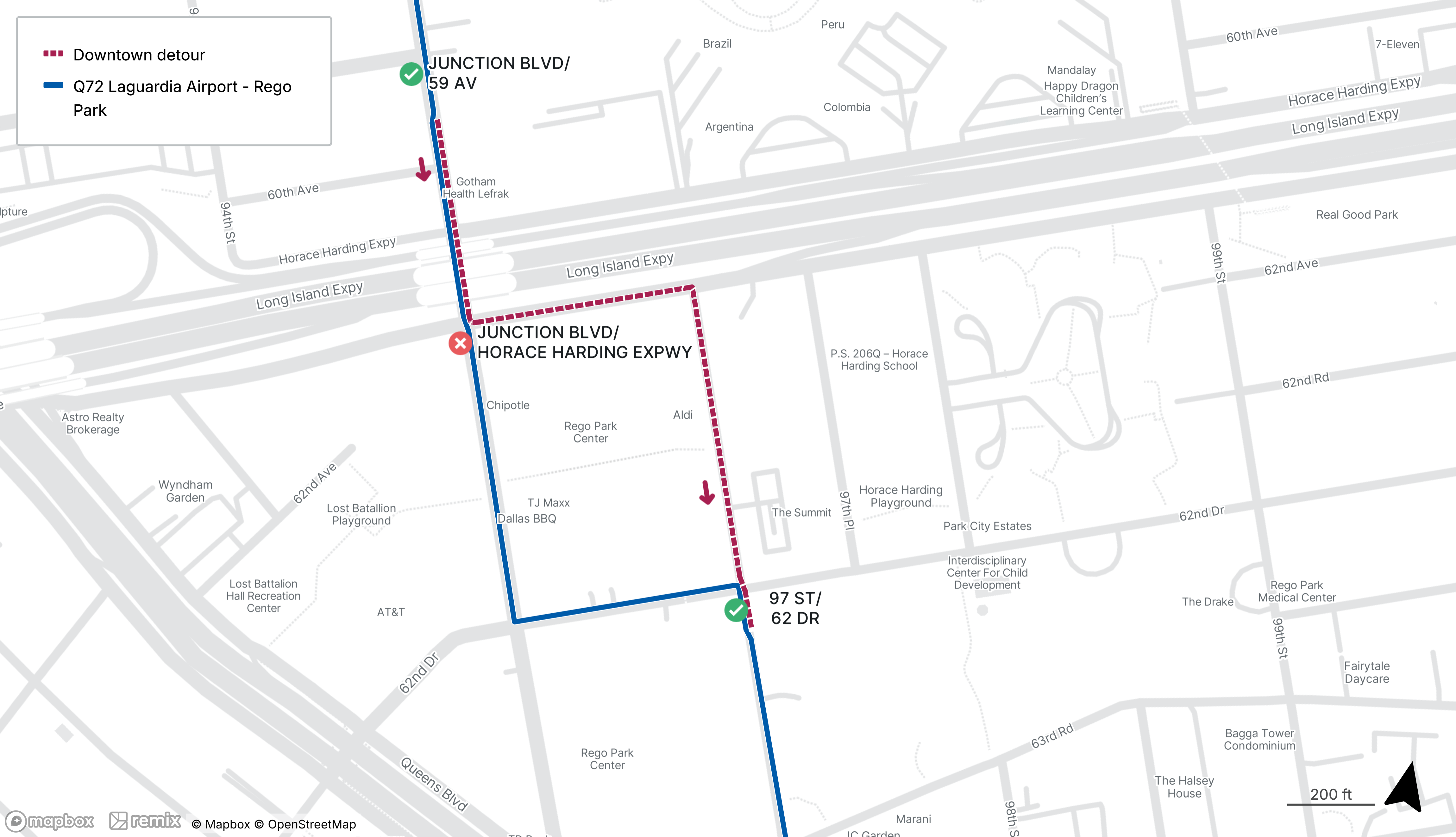 Southbound Q72 stop on Junction Blvd at Horace Harding Expressway will be closed, use the stops on Junction Blvd at 59th Ave or 97th St at 62nd Dr