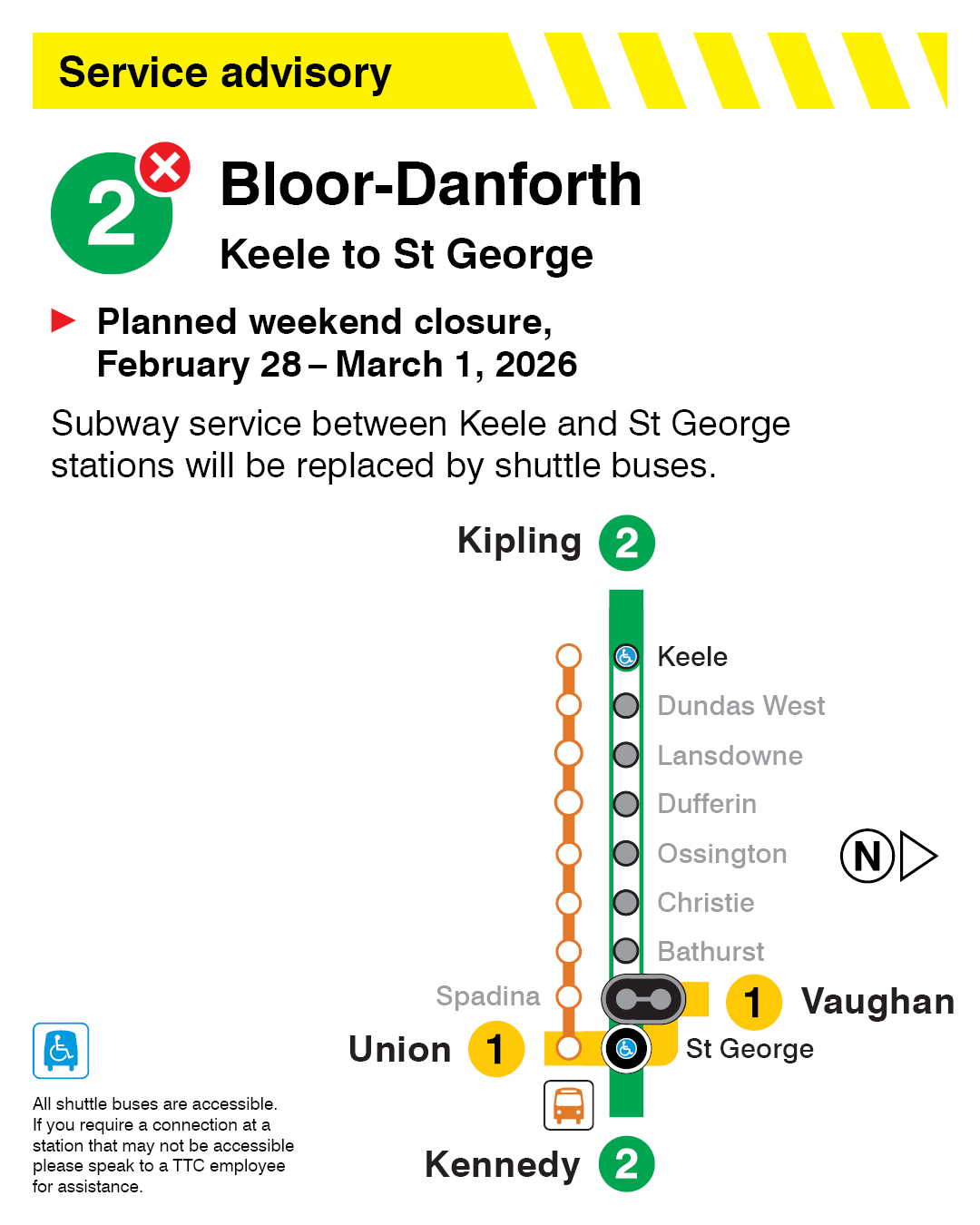 Line 2 Bloor-Danforth: This weekend, starting at 11:59 p.m. tonight, there will be no subway service between Keele and St George stations due to planned track work. Shuttle buses will operate. Started Until (Updated )