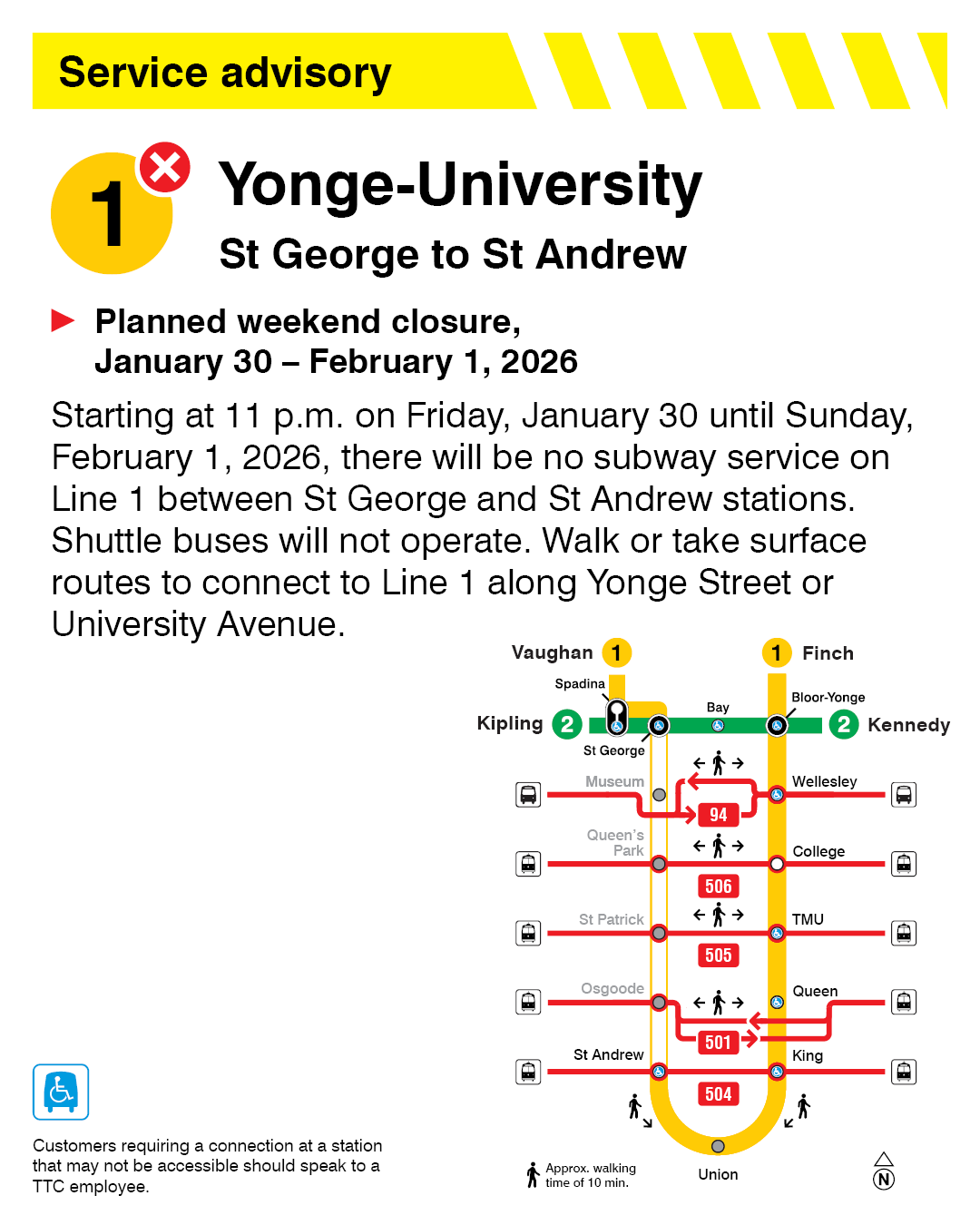 Line 1 Yonge-University: Starting tonight at 11 p.m., and all day Saturday and Sunday, there will be no subway service between St George and St Andrew stations due to planned station work. Shuttle buses will not operate. Started Until (Updated )