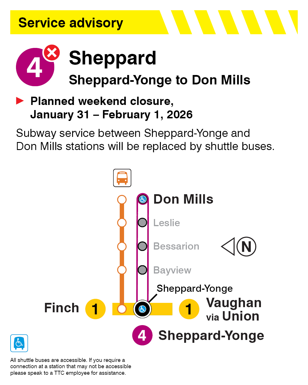 Line 4 Sheppard: This weekend, there will be no subway service between Sheppard-Yonge and Don Mills stations due to planned signal work. Shuttle buses will operate. Started Until Sat Jan 31 (Updated )