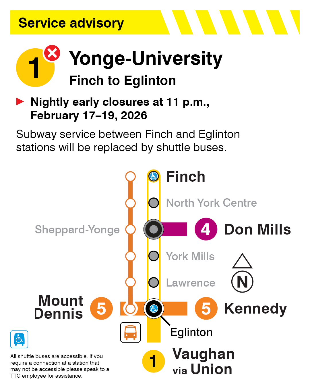 Line 1 Yonge-University: There will be no subway service between Finch and Eglinton stations, starting 11 p.m., nightly Tuesday, February 17 to Thursday, February 19, due to planned signal work. Shuttle buses will operate. Started Until Fri Feb 20 (Updated )