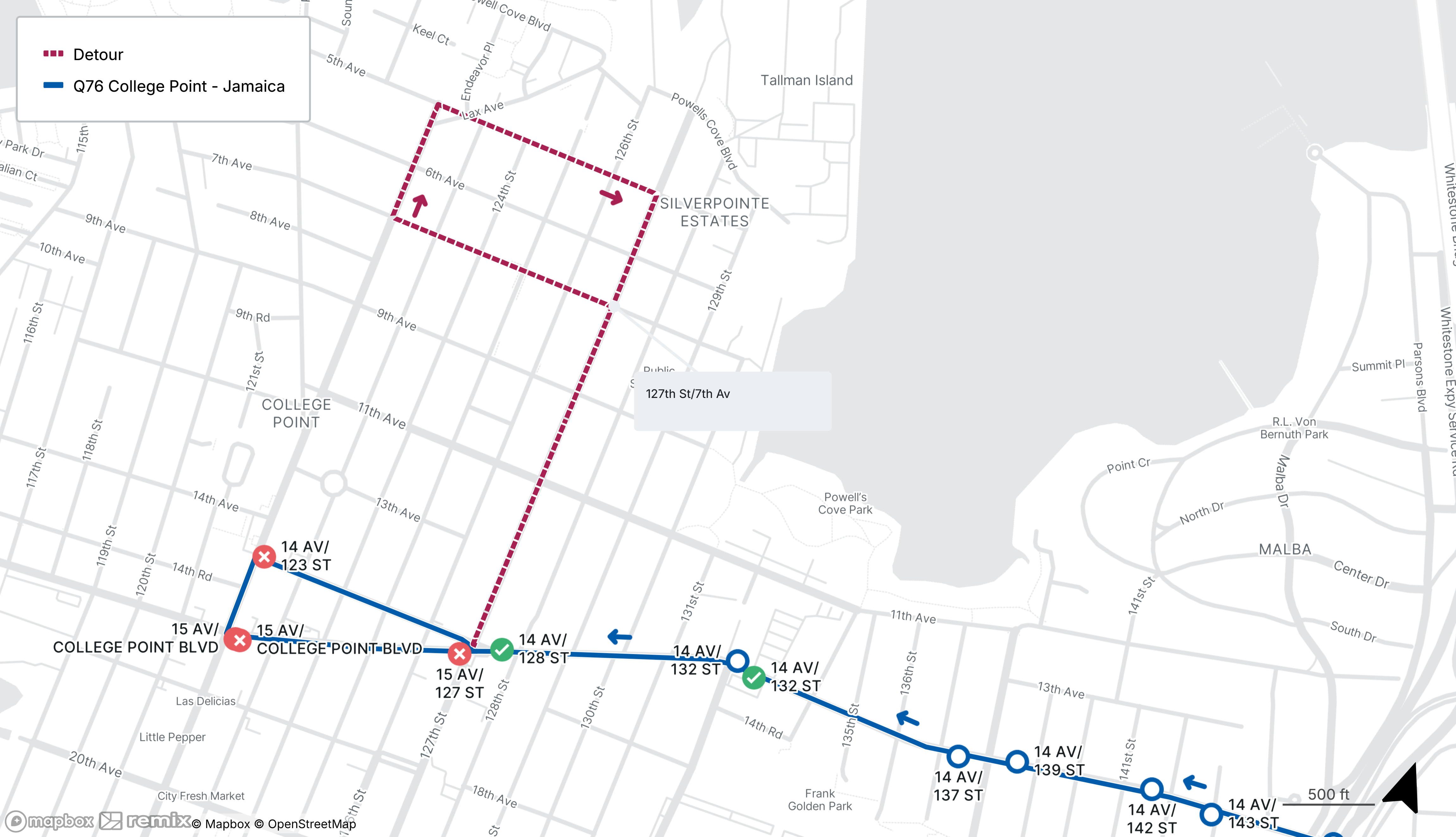 No Q76 service between 15th Ave at 127th St and 14th Ave at 123rd St