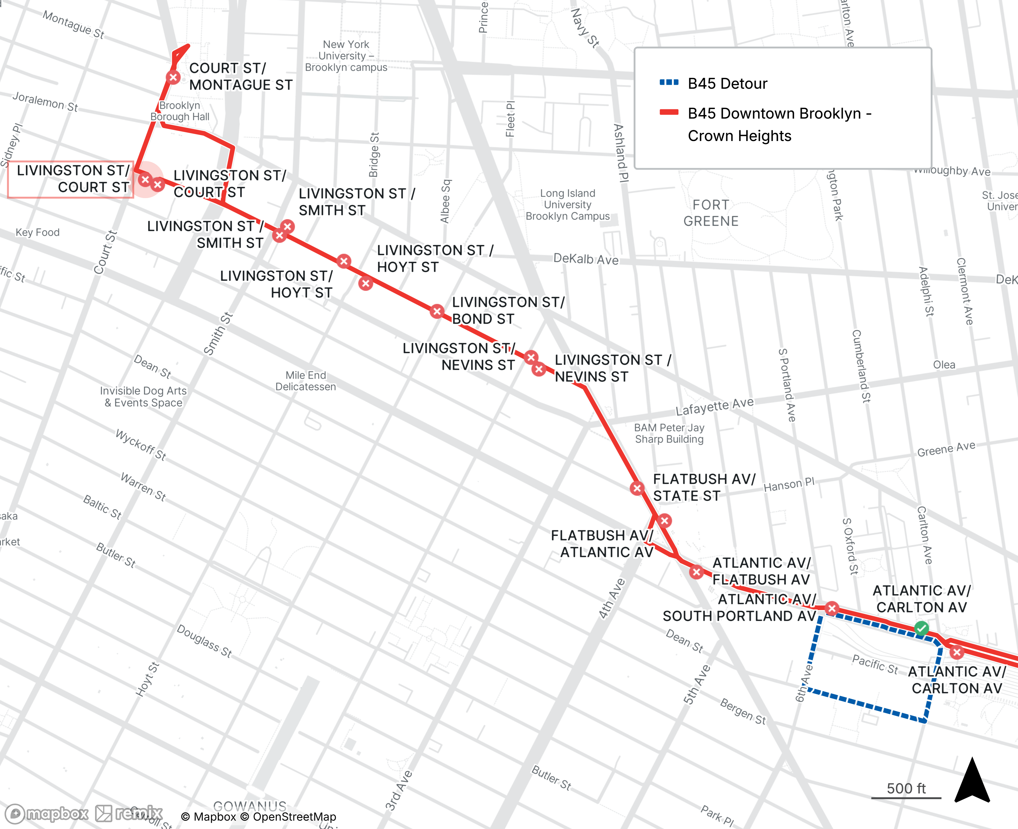 There is no B45 bus service between Downtown Brooklyn and Atlantic Ave at Carlton Ave