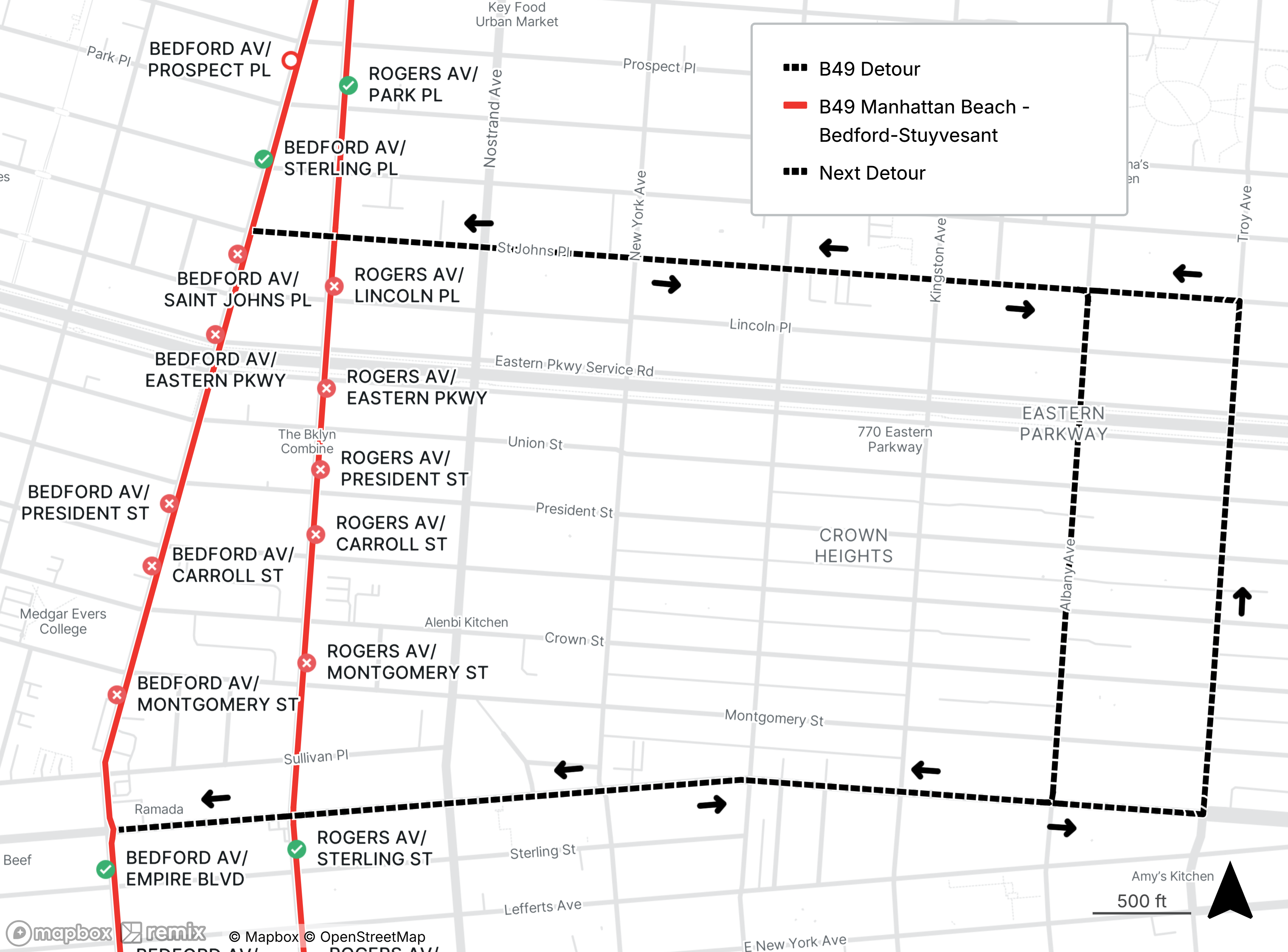B49 stops on Bedford Ave and Rogers Ave between Empire Blvd and Saint Johns Pl are closed